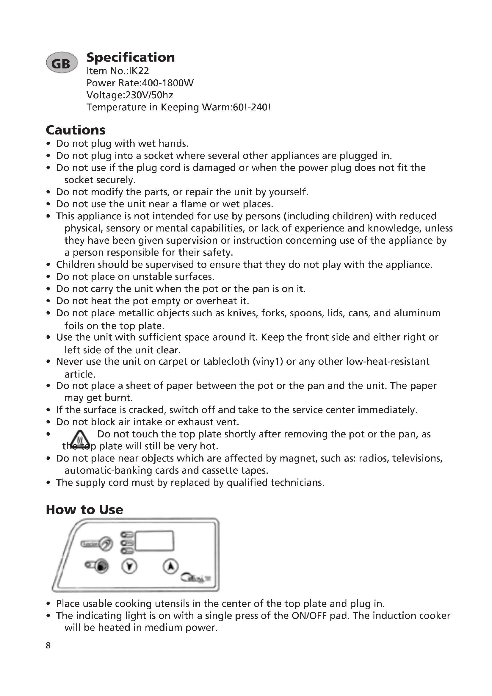 Specification Item No.:IK22 Power Rate:400-1800W Voltage:230V/50hz Temperature in Keeping Warm:60!-240! Cautions