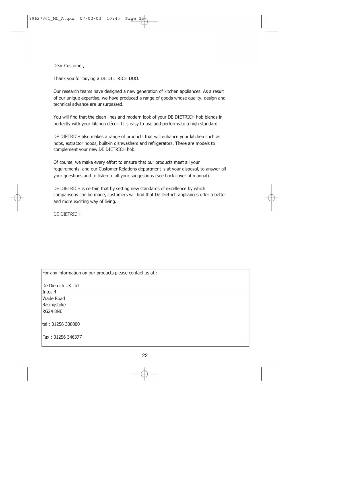 - 99627361_ML_A.qxd 07/03/03 10:45 Page 2122 For any information on our products please contact us at : De Dietrich UK Ltd Intec 4 Wade Road Basingstoke RG24 8NE tel : 01256 308000 Fax : 01256 346377 Dear Customer, Thank you for buying a DE DIETRICH DUO. Our research teams have designed a new generation of kitchen appliances. As a result of our unique expertise, we have produced a range of goods whose quality, design and technical advance are unsurpassed. You will find that the clean lines and modern look of your DE DIETRICH hob blends in perfectly with your kitchen décor. It is easy to use and performs to a high standard. DE DIETRICH also makes a range of products that will enhance your kitchen such as hobs, extractor hoods, built-in dishwashers and refrigerators. There are models to complement your new DE DIETRICH hob. Of course, we make every effort to ensure that our products meet all your requirements, and our Customer Relations department is at your disposal, to answer all your questions and to listen to all your suggestions (see back cover of manual). DE DIETRICH is certain that by setting new standards of excellence by which comparisons can be made, customers will find that De Dietrich appliances offer a better and more exciting way of living. DE DIETRICH. 99627361_ML_A.qxd 07/03/03 10:45 Page 2223 In this Manual, displays safety instructions displays tips and hints Using your duo in complete safety p. 24