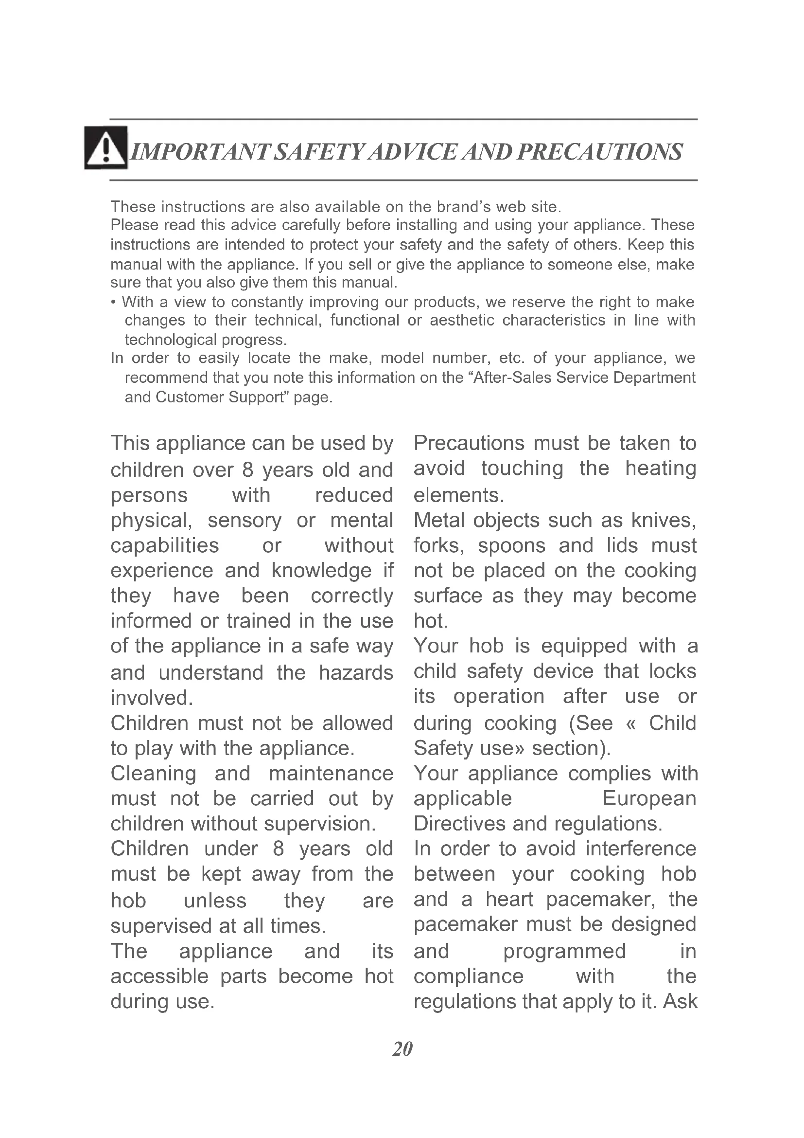 This appliance can be used by children over 8 years old and persons with reduced physical, sensory or mental capabilities or without experience and knowledge if they have been correctly informed or trained in the use of the appliance in a safe way and understand the hazards involved. Children must not be allowed to play with the appliance. Cleaning and maintenance must not be carried out by children without supervision. Children under 8 years old must be kept away from the hob unless they are supervised at all times. The appliance and its accessible parts become hot during use. Precautions must be taken to avoid touching the heating elements. Metal objects such as knives, forks, spoons and lids must not be placed on the cooking surface as they may become hot. Your hob is equipped with a child safety device that locks its operation after use or during cooking (See « Child Safety use» section). Your appliance complies with applicable European Directives and regulations. In order to avoid interference between your cooking hob and a heart pacemaker, the pacemaker must be designed and programmed in compliance with the regulations that apply to it. Ask21