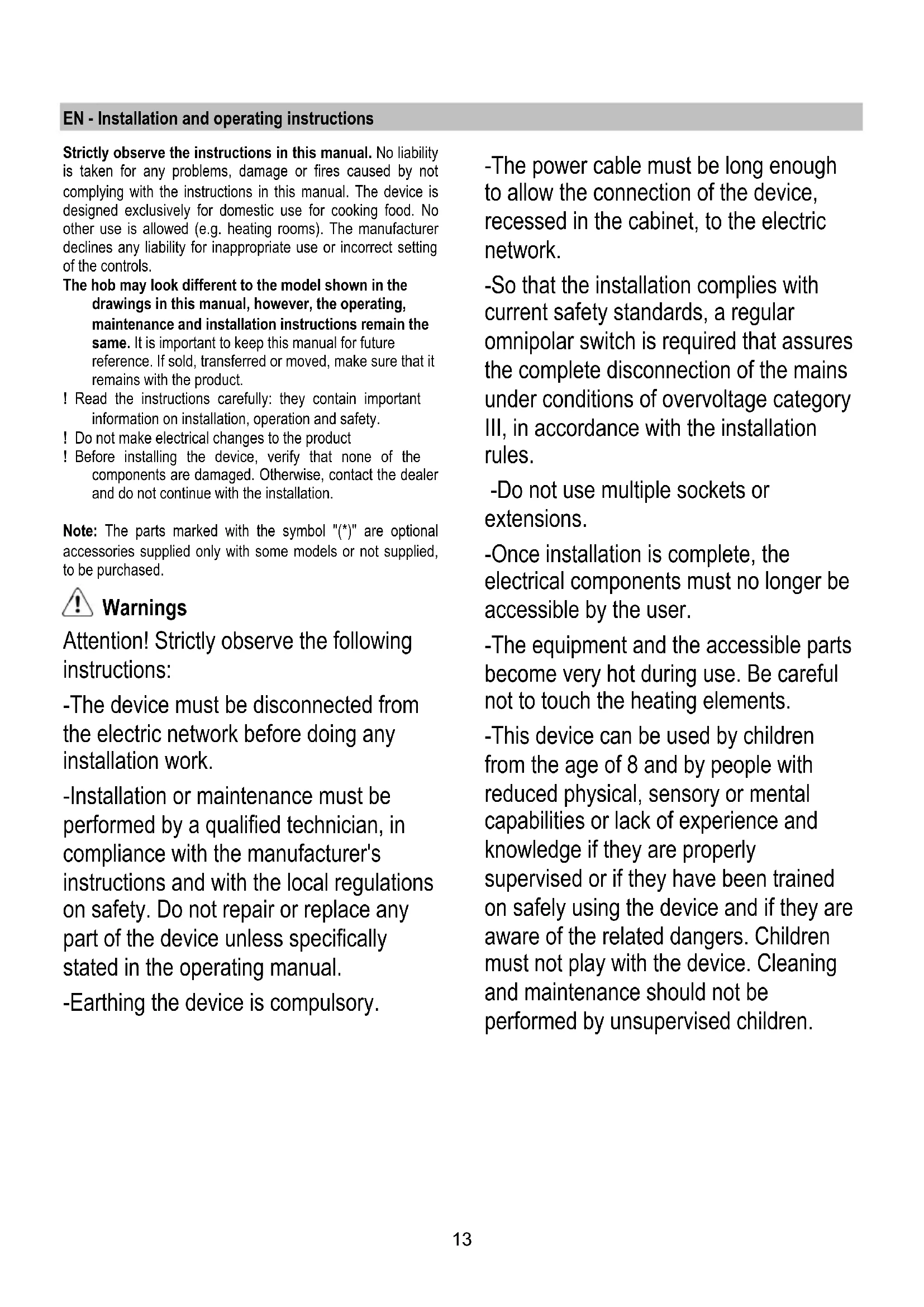 Min. Ø 110mm 3,7 kw13 EN - Installation and operating instructions Strictly observe the instructions in this manual. No liability is taken for any problems, damage or fires caused by not complying with the instructions in this manual. The device is designed exclusively for domestic use for cooking food. No other use is allowed (e.g. heating rooms). The manufacturer declines any liability for inappropriate use or incorrect setting of the controls. The hob may look different to the model shown in the drawings in this manual, however, the operating, maintenance and installation instructions remain the same. It is important to keep this manual for future reference. If sold, transferred or moved, make sure that it remains with the product. ! Read the instructions carefully: they contain important information on installation, operation and safety. ! Do not make electrical changes to the product ! Before installing the device, verify that none of the components are damaged. Otherwise, contact the dealer and do not continue with the installation. Note: The parts marked with the symbol "(*)" are optional accessories supplied only with some models or not supplied, to be purchased. Warnings Attention! Strictly observe the following instructions: -The device must be disconnected from the electric network before doing any installation work. -Installation or maintenance must be performed by a qualified technician, in compliance with the manufacturer's instructions and with the local regulations on safety. Do not repair or replace any part of the device unless specifically stated in the operating manual. -Earthing the device is compulsory. -The power cable must be long enough to allow the connection of the device, recessed in the cabinet, to the electric network. -So that the installation complies with current safety standards, a regular omnipolar switch is required that assures the complete disconnection of the mains under conditions of overvoltage category III, in accordance with the installation rules. -Do not use multiple sockets or extensions. -Once installation is complete, the electrical components must no longer be accessible by the user. -The equipment and the accessible parts become very hot during use. Be careful not to touch the heating elements. -This device can be used by children from the age of 8 and by people with reduced physical, sensory or mental capabilities or lack of experience and knowledge if they are properly supervised or if they have been trained on safely using the device and if they are aware of the related dangers. Children must not play with the device. Cleaning and maintenance should not be performed by unsupervised children.14 - Be careful that children do not play with the device; keep children away and supervise them, because the accessible parts may become very hot during use. - For people with pacemakers and active implants it is important to check, prior to using the induction hob, that their pacemaker is compatible with the device. - During and after use, do not touch the heating elements of the device. - Avoid contact with cloths or other flammable material until all the device components have sufficiently cooled. - Do not place flammable materials on or near the device. - Overheated fats and oils easily catch fire. Supervise the cooking of foods rich in fat and oil. - Cleaning and maintenance operations executable by the user must not be performed by children without the supervision of a responsible person. - It is compulsory to install a separator panel (not supplied) in the space under the device. - If the surface is cracked, switch off the device to avoid the possibility of electric shock. - The device is not intended to be put into operation by means of an external timer or a separate remote control system.