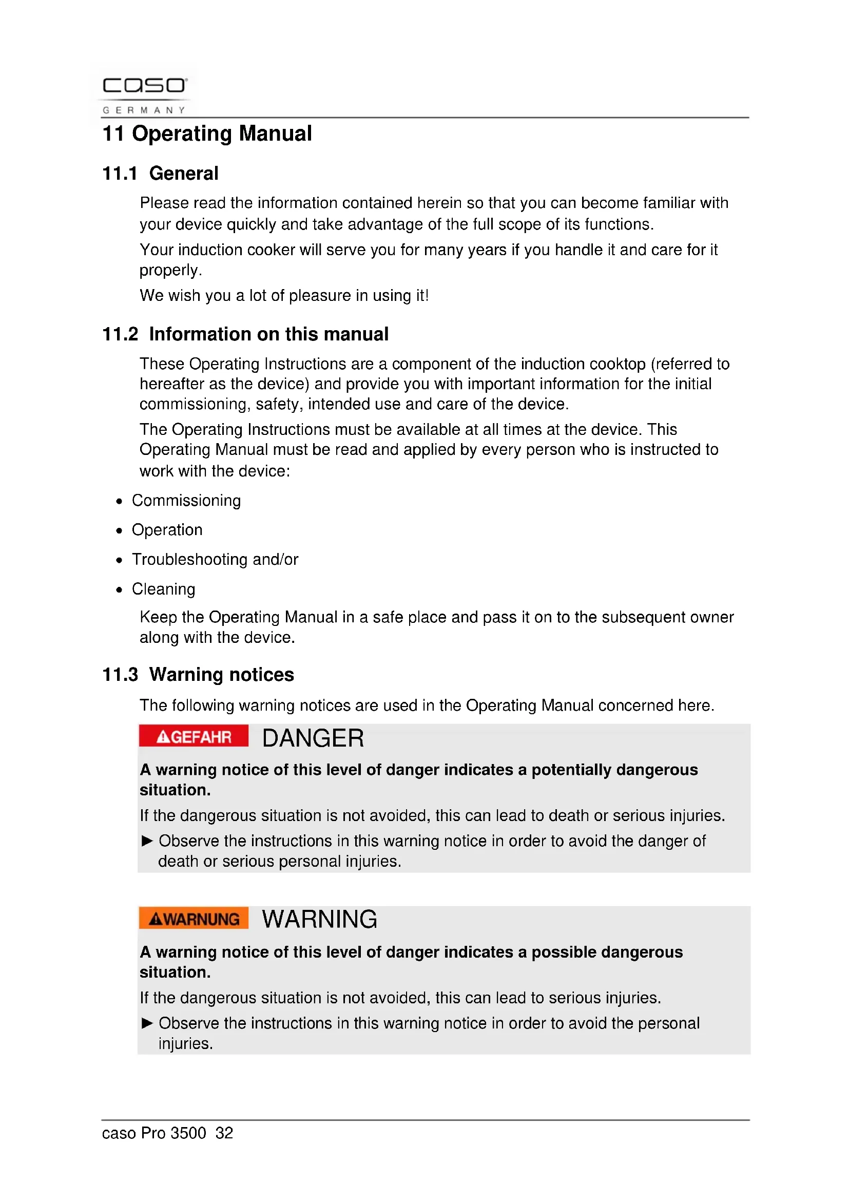 Please note Please observe the following general safety notices with regard to the safe handling of the device. ► Examine the device for any visible external damages prior to using it. Never put a damaged device into operation. ► If the connection lead is damaged, you will need to have a special connection lead installed by an authorized electrician. ► This appliance can be used by children aged 8 years and above and persons with reduced physical, sensory or mental capabilities or lack of experience and knowledge if they have been given supervision or instruction concerning use of the appliance in a safe way and understand the hazards involved. ► Children shall not play with the appliance. ► Cleaning and user maintenance shall not be made by children without supervision. ► Keep the appliance and its power cable out of reach of children under the age of 8 years. ► Do not leave the device unsupervised when it is in operation.caso Pro 3500 35 Please note ► Only qualified electricians, who have been trained by the manufacturer, may carry out any repairs that may be needed. Improperly performed repairs can cause considerable dangers for the user. ► Only customer service departments authorized by the manufacturer may carry out repairs on the device during the guarantee period, as otherwise the guarantee entitlements will be null and void in the event of any subsequent damages. ► Defective components must always be replaced with original replacement parts. Only such parts will guarantee that the safety requirements are fulfilled. ► Never move the device by pulling on the power cable. ► Metallic objects such as knives, forks, spoons and lids should not be placed on the hotplate since they can get hot. ► Device is not intended to be operated by means of an external timer or separate remote-control system.