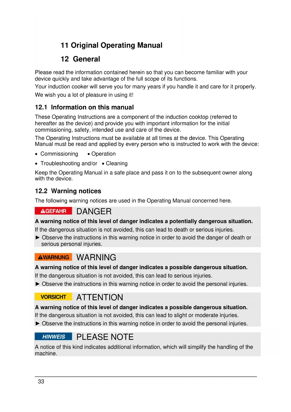 Item No. 200633 11 Original Operating Manual 12 General Please read the information contained herein so that you can become familiar with your device quickly and take advantage of the full scope of its functions. Your induction cooker will serve you for many years if you handle it and care for it properly. We wish you a lot of pleasure in using it!