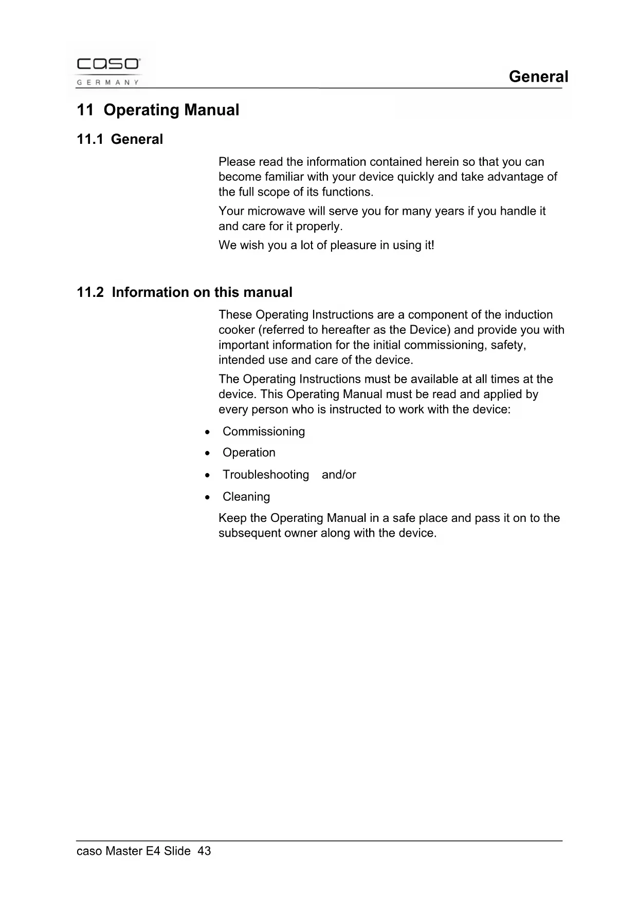 - Cleaning Keep the Operating Manual in a safe place and pass it on to the subsequent owner along with the device.General caso Master E4 Slide 44