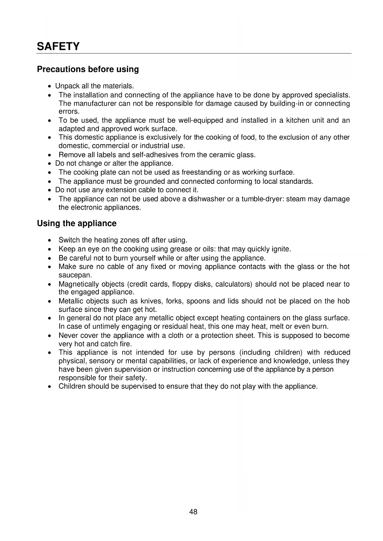 - ELECTRICAL CONNECTION SAFETY Precautions before using Unpack all the materials. The installation and connecting of the appliance have to be done by approved specialists. The manufacturer can not be responsible for damage caused by building-in or connecting errors. To be used, the appliance must be well-equipped and installed in a kitchen unit and an adapted and approved work surface. This domestic appliance is exclusively for the cooking of food, to the exclusion of any other domestic, commercial or industrial use. Remove all labels and self-adhesives from the ceramic glass. Do not change or alter the appliance. The cooking plate can not be used as freestanding or as working surface. The appliance must be grounded and connected conforming to local standards. Do not use any extension cable to connect it. The appliance can not be used above a dishwasher or a tumble-dryer: steam may damage the electronic appliances. Using the appliance Switch the heating zones off after using. Keep an eye on the cooking using grease or oils: that may quickly ignite. Be careful not to burn yourself while or after using the appliance. Make sure no cable of any fixed or moving appliance contacts with the glass or the hot saucepan. Magnetically objects (credit cards, floppy disks, calculators) should not be placed near to the engaged appliance. Metallic objects such as knives, forks, spoons and lids should not be placed on the hob surface since they can get hot. In general do not place any metallic object except heating containers on the glass surface. In case of untimely engaging or residual heat, this one may heat, melt or even burn. Never cover the appliance with a cloth or a protection sheet. This is supposed to become very hot and catch fire. This appliance is not intended for use by persons (including children) with reduced physical, sensory or mental capabilities, or lack of experience and knowledge, unless they have been given supervision or instruction concerning use of the appliance by a person responsible for their safety. Children should be supervised to ensure that they do not play with the appliance.49 Precautions not to damage the appliance Raw pan bottoms or damaged saucepans (not enamelled cast iron pots,) may damage the ceramic glass. Sand or other abrasive materials may damage ceramic glass. Avoid dropping objects, even little ones, on the vitroceramic. Do not hit the edges of the glass with saucepans. Make sure that the ventilation of the appliance works according to the manufacturer’s instructions. Do not put or leave empty saucepans on the vitroceramic hobs. Sugar, synthetic materials or aluminium sheets must not contact with the heating zones. These may cause breaks or other alterations of the vitroceramic glass by cooling: switch on the appliance and take them immediately out of the hot heating zone (be careful: do not burn yourself). Never place any hot container over the control panel. If a drawer is situated under the embedded appliance, make sure the space between the content of the drawer and the inferior part of the appliance is large enough (2 cm). This is essential to guaranty a correct ventilation. Never put any inflammable object (ex. sprays) into the drawer situated under the vitroceramic hob. The eventual cutlery drawers must be resistant to heat. Precautions in case of appliance failure If a defect is noticed, switch off the appliance and turn off the electrical supplying. If the ceramic glass is cracked or fissured, you must unplug the appliance and contact the after sales service. Repairing has to be done by specialists. Do not open the appliance by yourself. p. 5948
