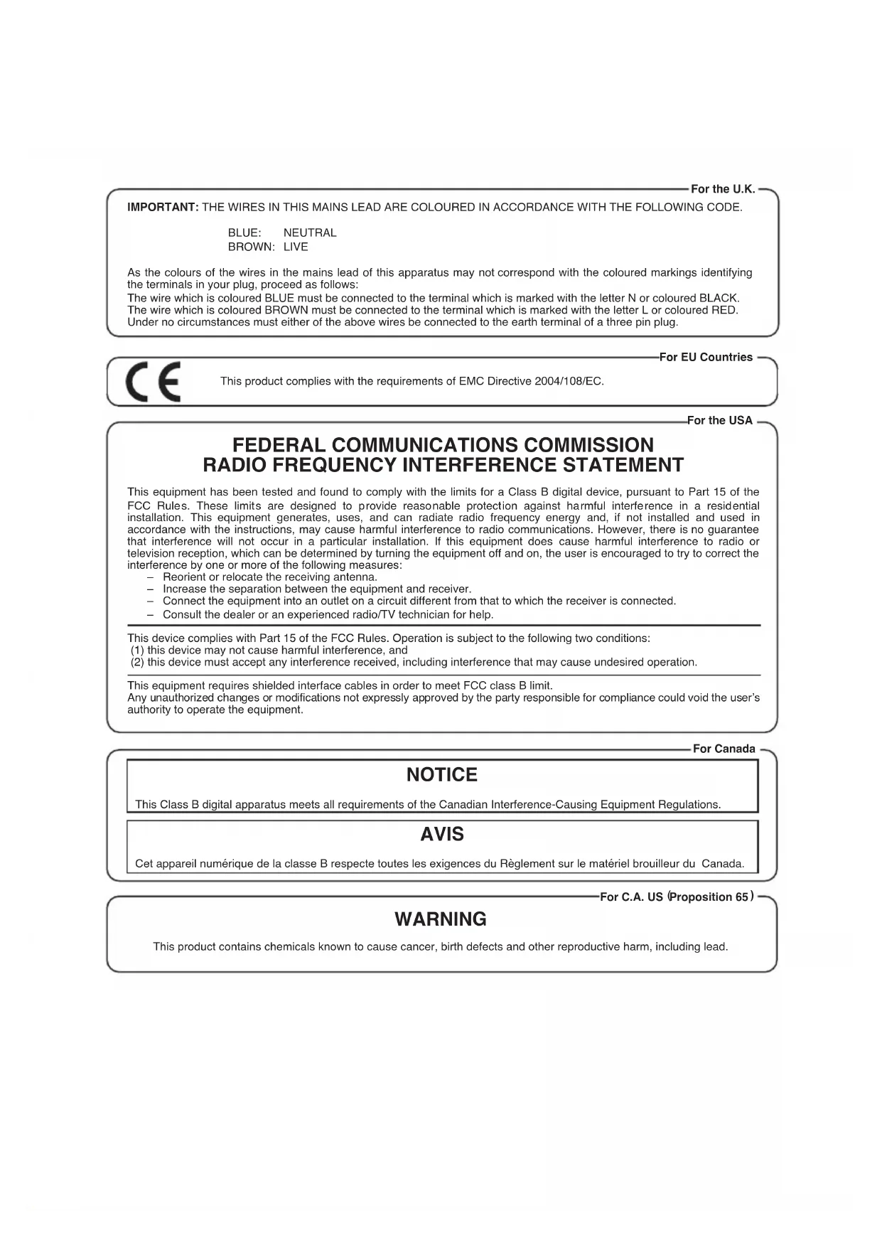 This equipment has been tested and found to comply with the limits for a Class B digital device, pursuant to Part 15 of the FCC Rules. These limits are designed to provide reasonable protection against harmful interference in a residential installation. This equipment generates, uses, and can radiate radio frequency energy and, if not installed and used in accordance with the instructions, may cause harmful interference to radio communications. However, there is no guarantee that interference will not occur in a particular installation. If this equipment does cause harmful interference to radio or television reception, which can be determined by turning the equipment off and on, the user is encouraged to try to correct the interference by one or more of the following measures: – Reorient or relocate the receiving antenna. – Increase the separation between the equipment and receiver. – Connect the equipment into an outlet on a circuit different from that to which the receiver is connected. – Consult the dealer or an experienced radio/TV technician for help. This device complies with Part 15 of the FCC Rules. Operation is subject to the following two conditions: (1) this device may not cause harmful interference, and (2) this device must accept any interference received, including interference that may cause undesired operation. This equipment requires shielded interface cables in order to meet FCC class B limit. Any unauthorized changes or modifications not expressly approved by the party responsible for compliance could void the user’s authority to operate the equipment. For Canada WARNING This product contains chemicals known to cause cancer, birth defects and other reproductive harm, including lead. For C.A. US