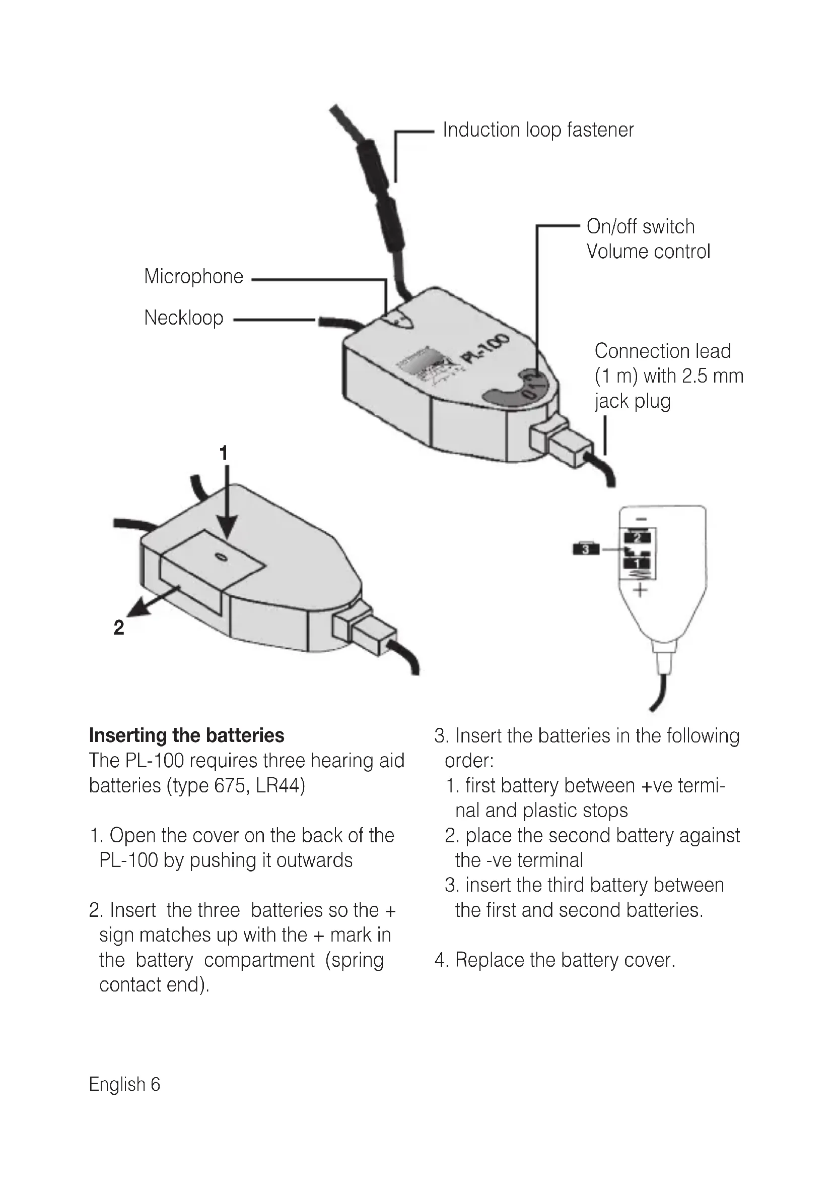 Induction loop fastener Microphone Neckloop On/off switch Volume control PL-100 Connection lead (1 m) with 2.5 mm jack plug 1 2 3Inserting the batteries