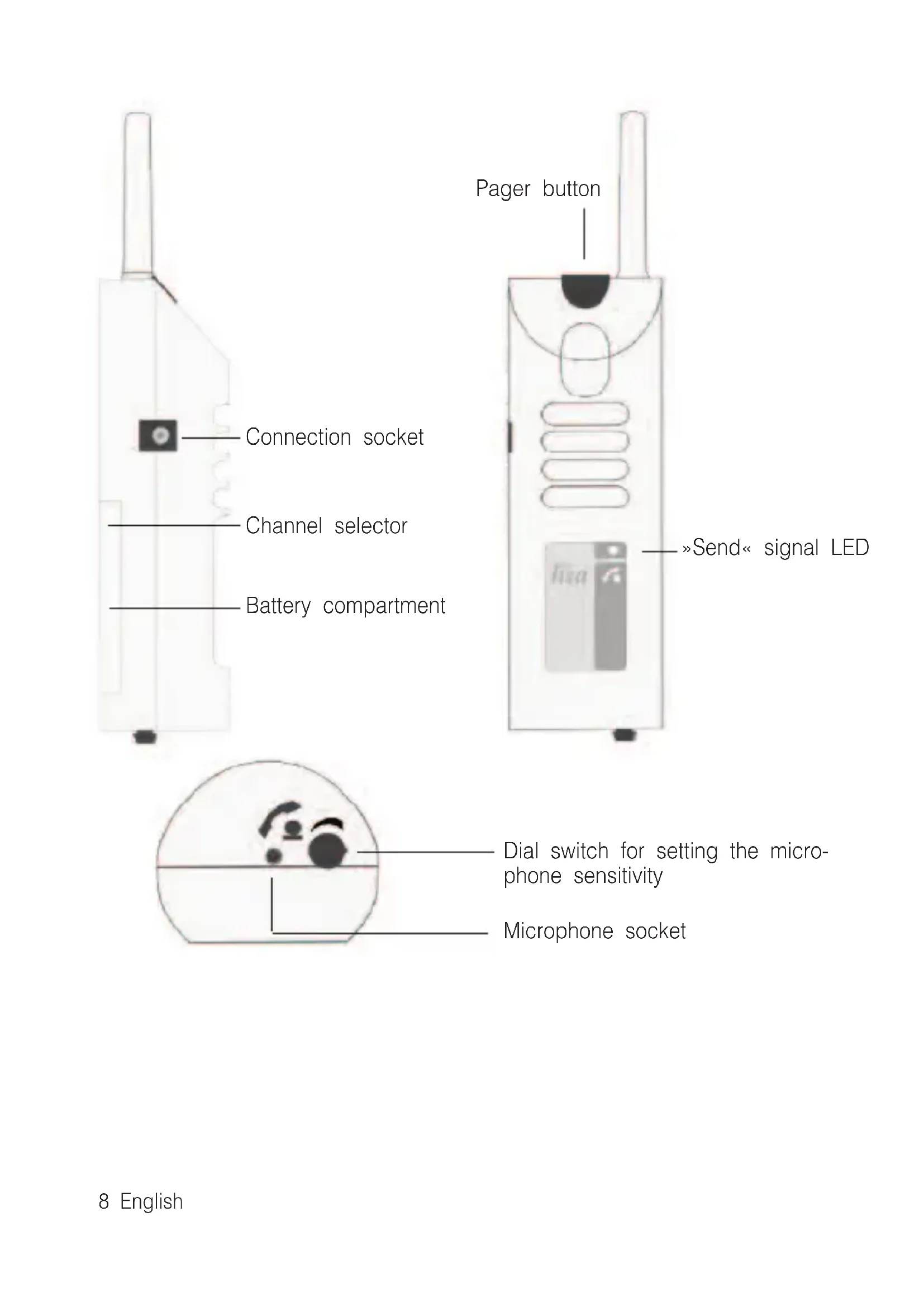 A special digital transmission process ensures that the radio signals are picked up without errors. This process also makes it possible to set 10 different radio channels. When supplied from the factory, all RFtelephonetransmittersacoustic are set to channel 0. It is only necessary to set units to other channels if you have several different users operating units in the same building.