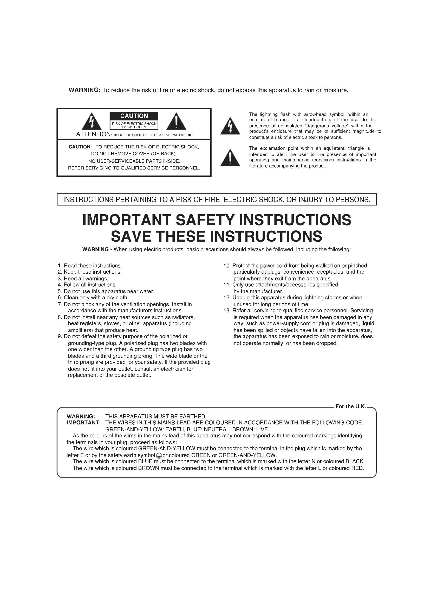 ATTENTION: RISQUE DE CHOC ELECTRIQUE NE PAS OUVRIR CAUTION: TO REDUCE THE RISK OF ELECTRIC SHOCK,DO NOT REMOVE COVER (OR BACK).NO USER-SERVICEABLE PARTS INSIDE.REFER SERVICING TO QUALIFIED SERVICE PERSONNEL.The lightning flash with arrowhead symbol, within an equilateral triangle, is intended to alert the user to the presence of uninsulated “dangerous voltage” within the product’s enclosure that may be of sufficient magnitude to constitute a risk of electric shock to persons.The exclamation point within an equilateral triangle is intended to alert the user to the presence of important operating and maintenance (servicing) instructions in the literature accompanying the product. INSTRUCTIONS PERTAINING TO A RISK OF FIRE, ELECTRIC SHOCK, OR INJURY TO PERSONS.