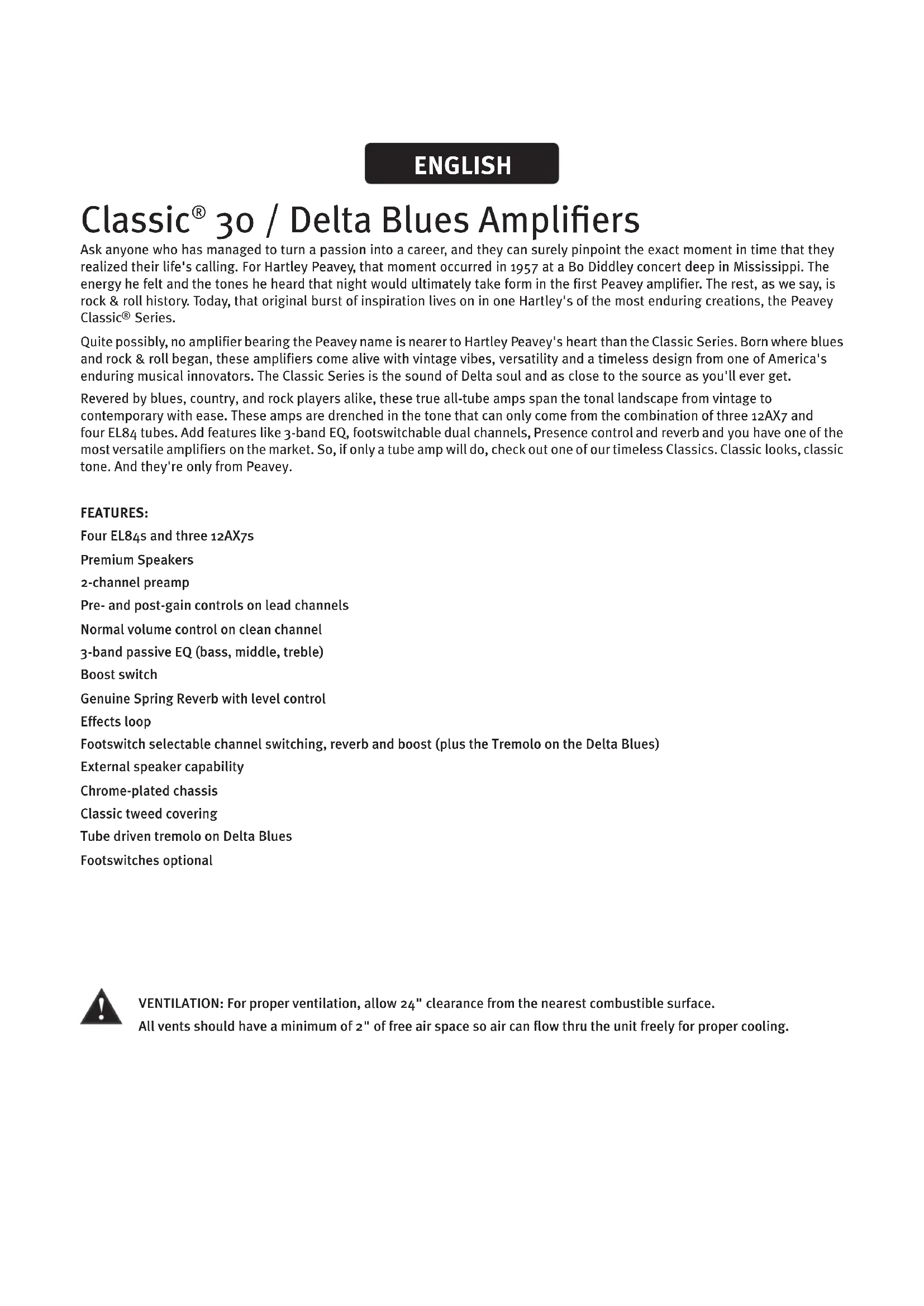 Series. Quite possibly, no amplifier bearing the Peavey name is nearer to Hartley Peavey's heart than the Classic Series. Born where blues and rock & roll began, these amplifiers come alive with vintage vibes, versatility and a timeless design from one of America's enduring musical innovators. The Classic Series is the sound of Delta soul and as close to the source as you'll ever get. Revered by blues, country, and rock players alike, these true all-tube amps span the tonal landscape from vintage to contemporary with ease. These amps are drenched in the tone that can only come from the combination of three 12AX7 and four EL84 tubes. Add features like 3-band EQ, footswitchable dual channels, Presence control and reverb and you have one of the most versatile amplifiers on the market. So, if only a tube amp will do, check out one of our timeless Classics. Classic looks, classic tone. And they're only from Peavey. FEATURES: Four EL84s and three 12AX7s Premium Speakers 2-channel preamp Pre- and post-gain controls on lead channels Normal volume control on clean channel 3-band passive EQ (bass, middle, treble) Boost switch Genuine Spring Reverb with level control Effects loop Footswitch selectable channel switching, reverb and boost (plus the Tremolo on the Delta Blues) External speaker capability Chrome-plated chassis Classic tweed covering Tube driven tremolo on Delta Blues Footswitches optional ENGLISH VENTILATION: For proper ventilation, allow 24" clearance from the nearest combustible surface. All vents should have a minimum of 2" of free air space so air can flow thru the unit freely for proper cooling.Classic