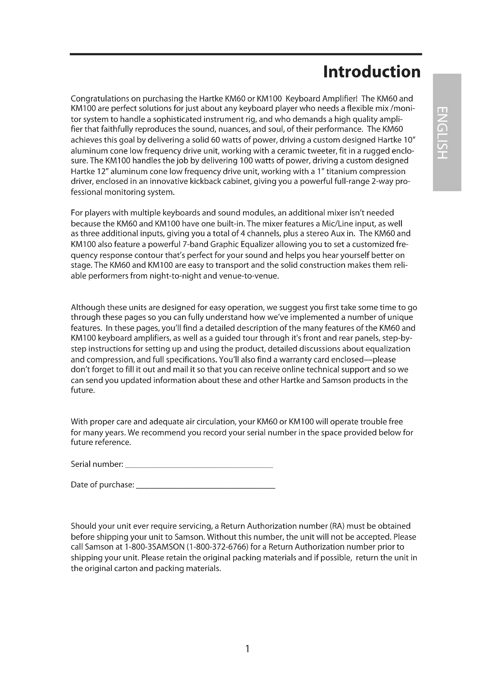 Although these units are designed for easy operation, we suggest you first take some time to go through these pages so you can fully understand how we've implemented a number of unique features. In these pages, you'll find a detailed description of the many features of the KM60 and KM100 keyboard amplifiers, as well as a guided tour through it's front and rear panels, step-by-step instructions for setting up and using the product, detailed discussions about equalization and compression, and full specifications. You'll also find a warranty card enclosed—please don't forget to fill it out and mail it so that you can receive online technical support and so we can send you updated information about these and other Hartke and Samson products in the future.