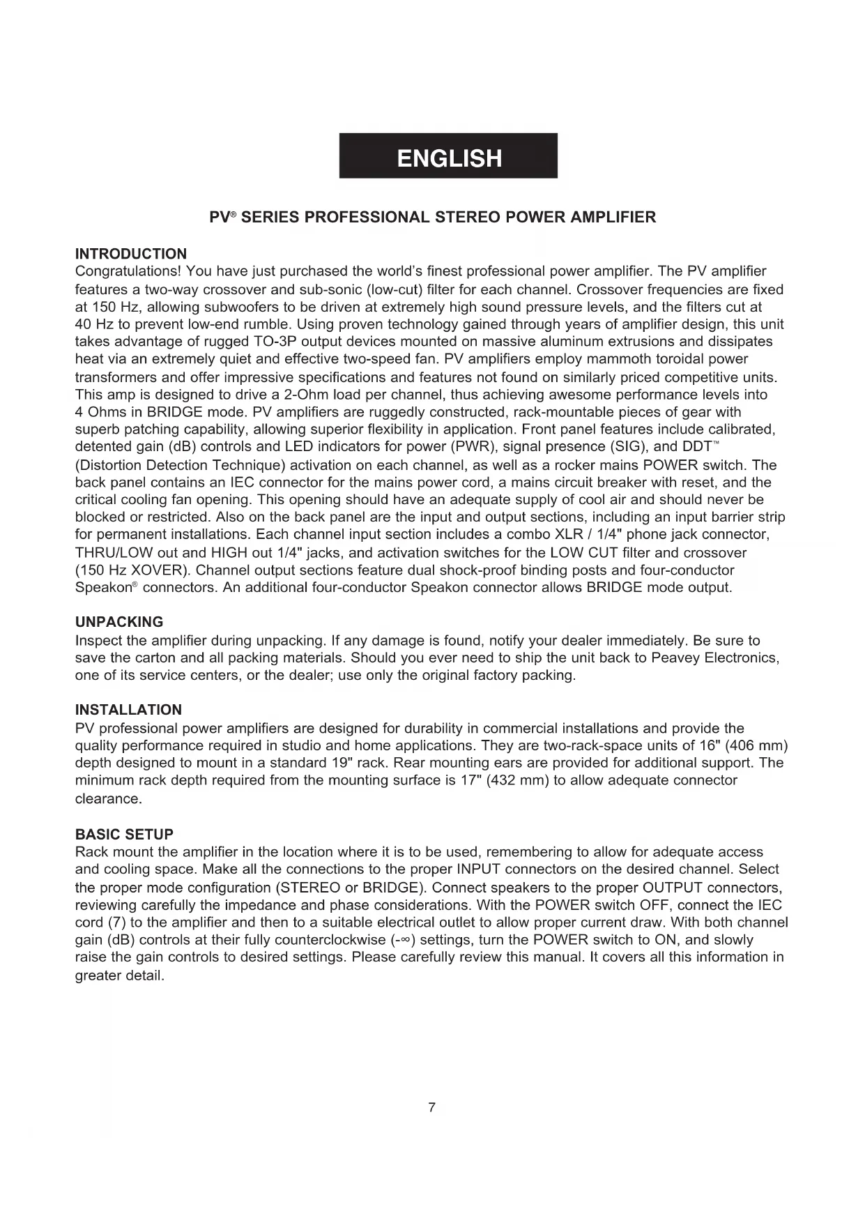 connectors. An additional four-conductor Speakon connector allows BRIDGE mode output. UNPACKING Inspect the amplifier during unpacking. If any damage is found, notify your dealer immediately. Be sure to save the carton and all packing materials. Should you ever need to ship the unit back to Peavey Electronics, one of its service centers, or the dealer; use only the original factory packing. INSTALLATION PV professional power amplifiers are designed for durability in commercial installations and provide the quality performance required in studio and home applications. They are two-rack-space units of 16" (406 mm) depth designed to mount in a standard 19" rack. Rear mounting ears are provided for additional support. The minimum rack depth required from the mounting surface is 17" (432 mm) to allow adequate connector clearance. BASIC SETUP Rack mount the amplifier in the location where it is to be used, remembering to allow for adequate access and cooling space. Make all the connections to the proper INPUT connectors on the desired channel. Select the proper mode configuration (STEREO or BRIDGE). Connect speakers to the proper OUTPUT connectors, reviewing carefully the impedance and phase considerations. With the POWER switch OFF, connect the IEC cord (7) to the amplifier and then to a suitable electrical outlet to allow proper current draw. With both channel gain (dB) controls at their fully counterclockwise (-∞) settings, turn the POWER switch to ON, and slowly raise the gain controls to desired settings. Please carefully review this manual. It covers all this information in greater detail.FRONT PANEL FEATURES (1) INPUT GAIN (dB) These controls are used to adjust the input gain of each channel. They determine how “loud” each channel of the power amplifier will sound for a given input signal level. Maximum input gain is achieved at the fully clockwise setting (+32 dB, 40 X), and this setting yields maximum mixer/system headroom. A setting of less than fully clockwise will yield lower system noise at the expense of mixer/system headroom. Turning the control fully counterclockwise is the “off” setting (-∞). It is always a good idea to power up any new installation at this setting to protect the system loudspeakers. (2) POWER LEDS (PWR) These indicators illuminate when the AC mains power is being supplied to the amp and both channels are operational. If either channel experiences fault conditions, exceeds safe operating temperature limits, or if the mains circuit breaker trips; both channel power LEDs will be dark, indicating “shutdown”. If the BRIDGE mode is selected, the PWR indicator on channel B will remain dark as a positive indication of this mode selection. (3) SIGNAL ACTIVITY LEDS (SIG) These indicators illuminate when the associated channel output signal level exceeds 1 V RMS. (4) DDT