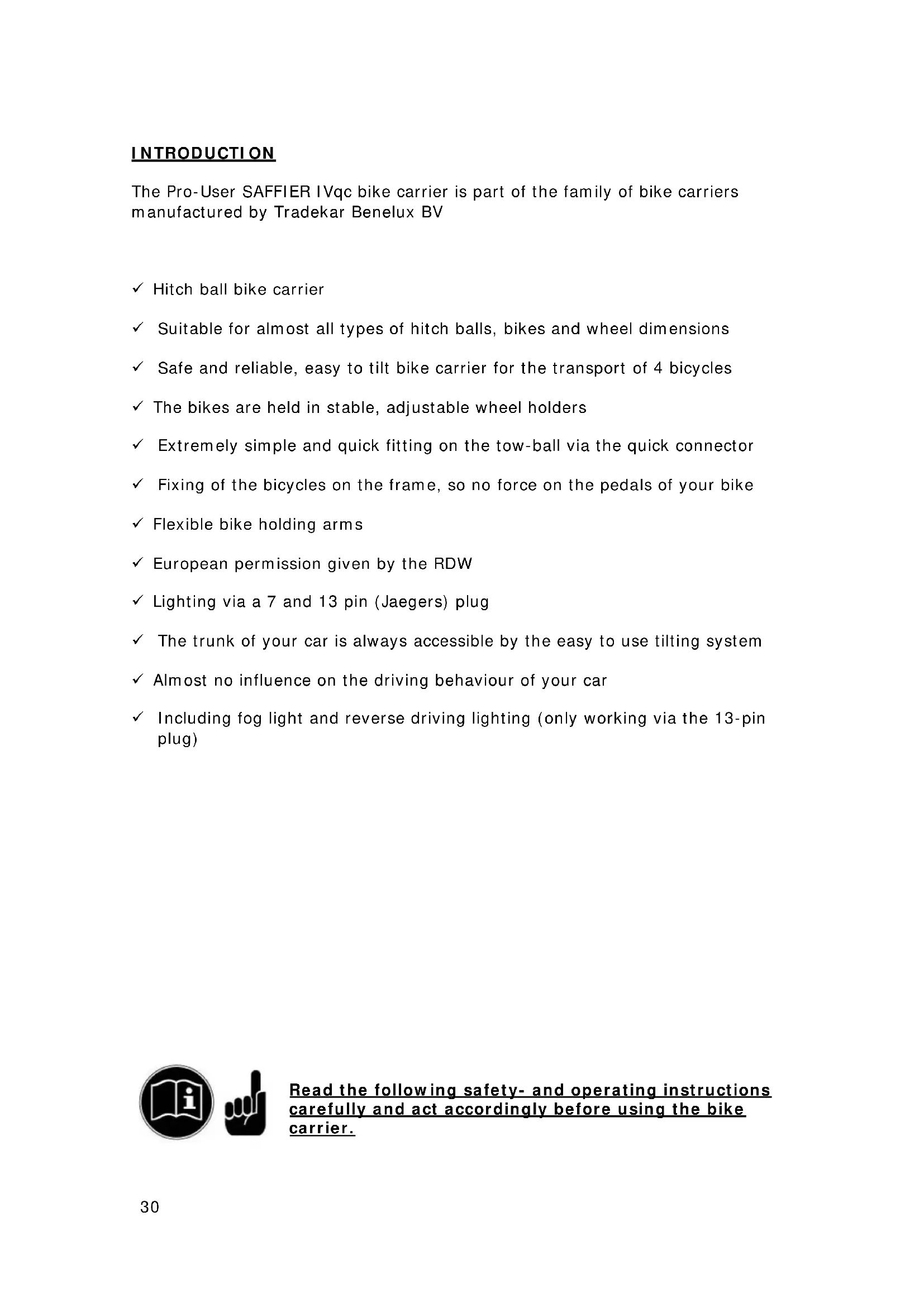 Download the instructions for your Bike rack in PDF format for free! Find your manual Saffier IVqc 91723 - Pro-User and take your electronic device back in hand. On this page are published all the documents necessary for the use of your device. Saffier IVqc 91723 by Pro-User.