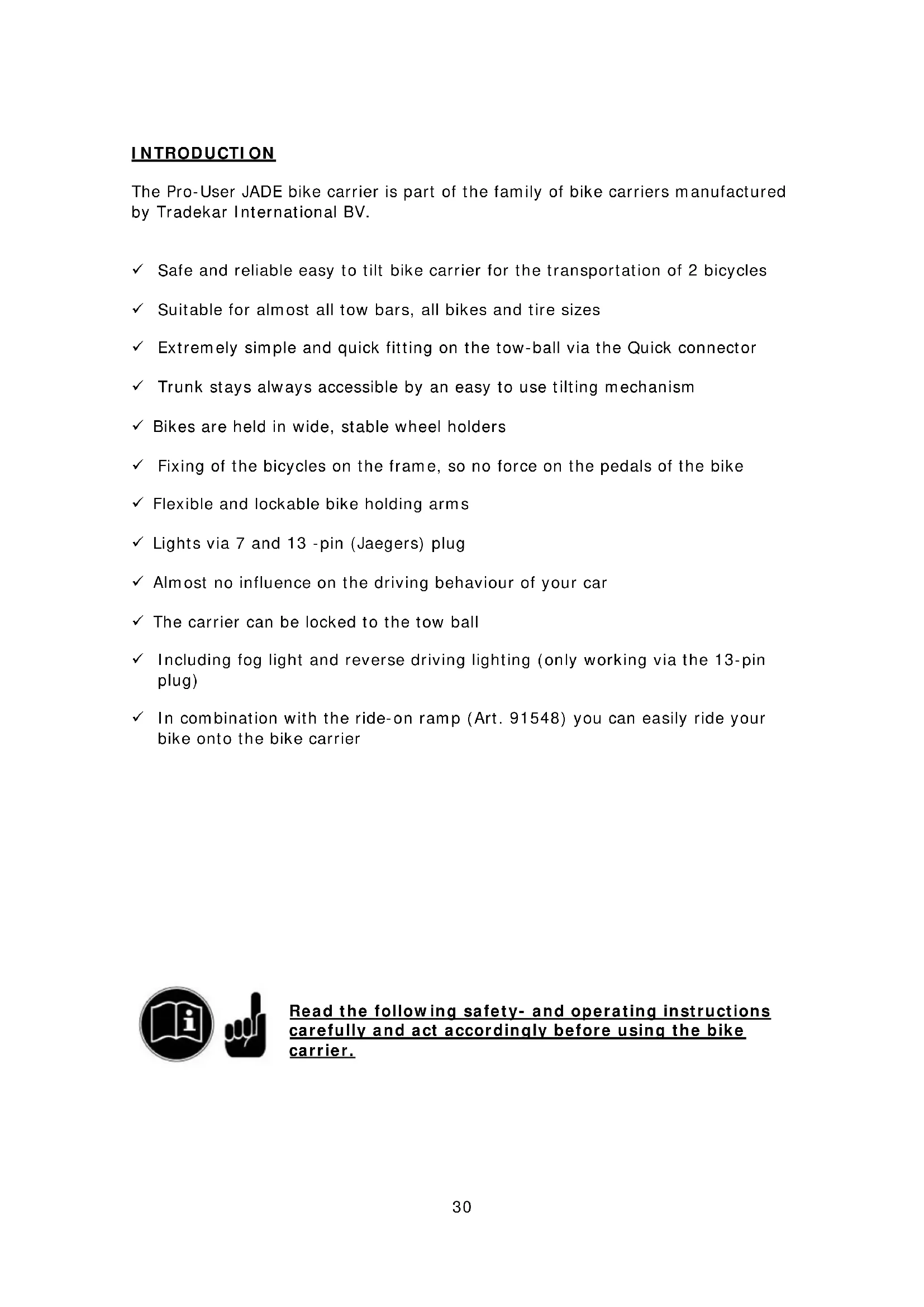 Read the following safety- and operating instructions carefully and act accordingly before using the bike carrier.