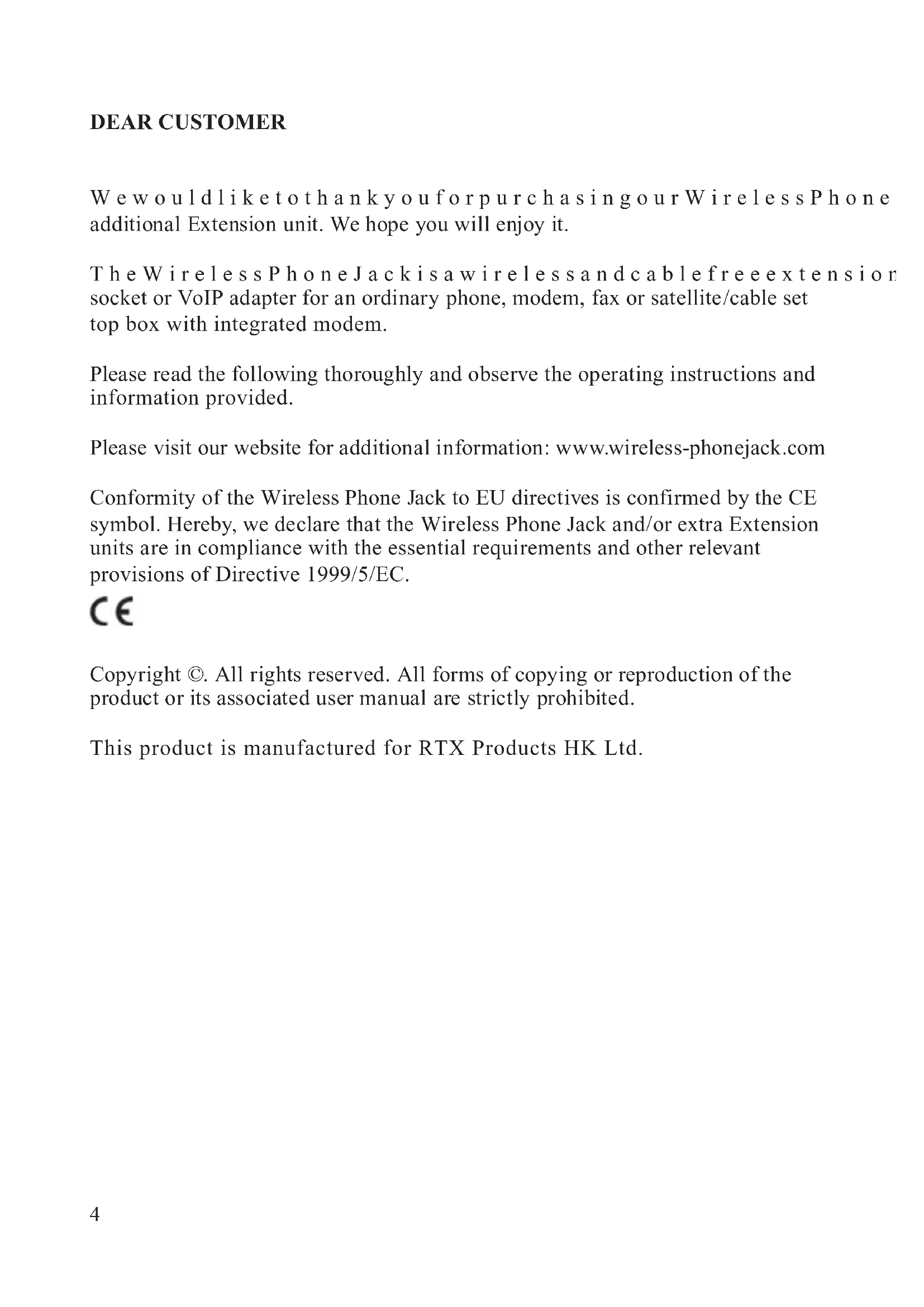 User Manual 50 meter wireless phone line24 DEAR CUSTOMER WewouldliketothankyouforpurchasingourWirelessPhoneJackand/oran additional Extension unit. We hope you will enjoy it. TheWirelessPhoneJackisawirelessandcablefreeextensionofthephone socket or VoIP adapter for an ordinary phone, modem, fax or satellite/cable set top box with integrated modem. Please read the following thoroughly and observe the operating instructions and informa tion provided. Please visit our website for additional information: www.wireless-phonejack.com Conformity of the Wireless Phone Jack to EU directives is confirmed by the CE symbol. Hereby, we declare that the Wireless Phone Jack and/or extra Extension units are in compliance with the essential requirements and other relevant provisions of Directive 1999/5/EC. Copyright ©. All rights reserved. All forms of copying or reproduction of the product or its associated user manual are strictly prohibited. This product is manufactured for RTX Products HK Ltd.5 UNPACKING Carefully remove units from the packaging. If there is any visible damage DO NOT attempt to operate the Wireless Phone Jack. Contact your dealer or shipping carrier immediately. BOX CONTENTS: