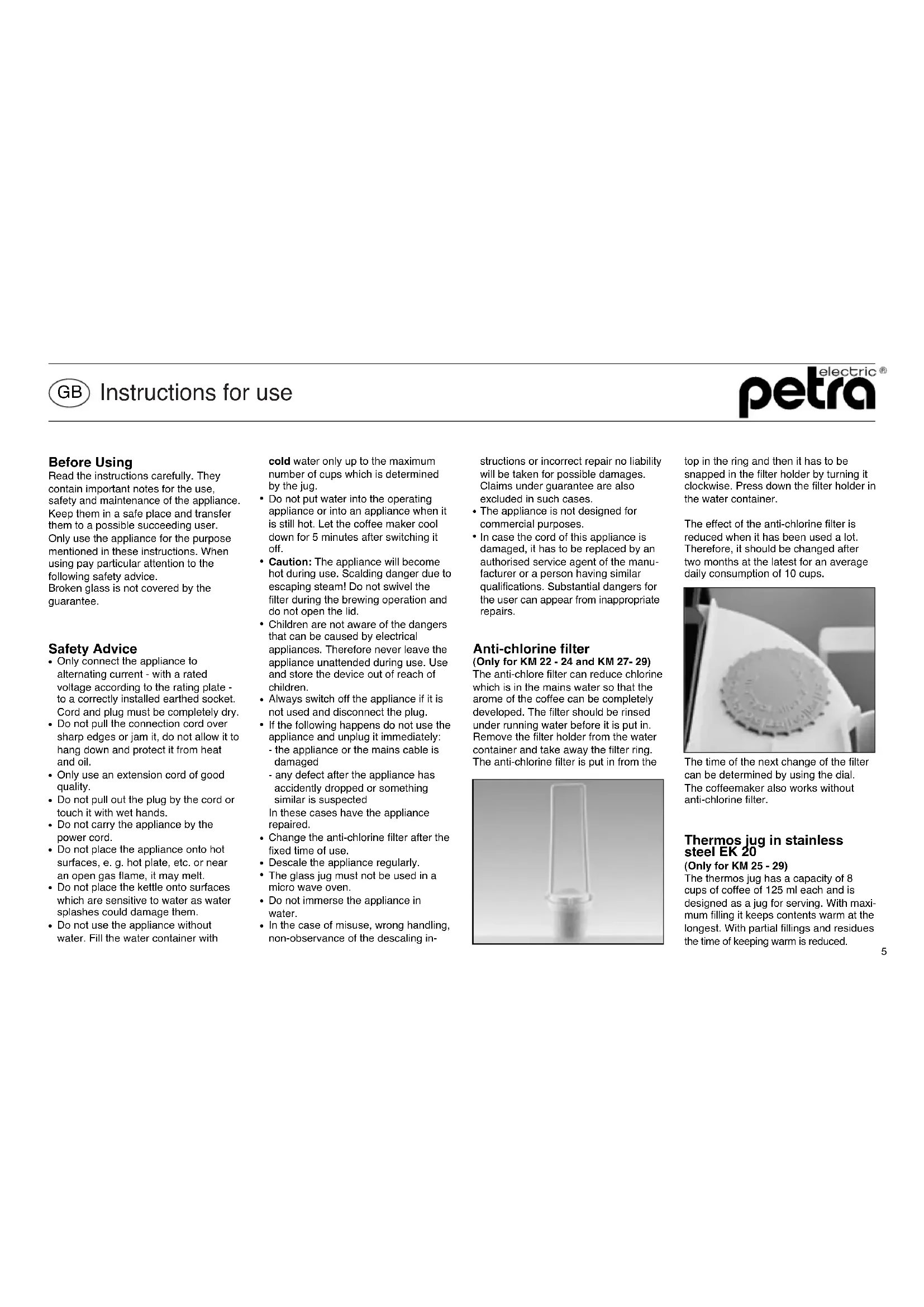 Download the instructions for your Coffee machine in PDF format for free! Find your manual KM 28 - Petra Electric and take your electronic device back in hand. On this page are published all the documents necessary for the use of your device. KM 28 by Petra Electric.