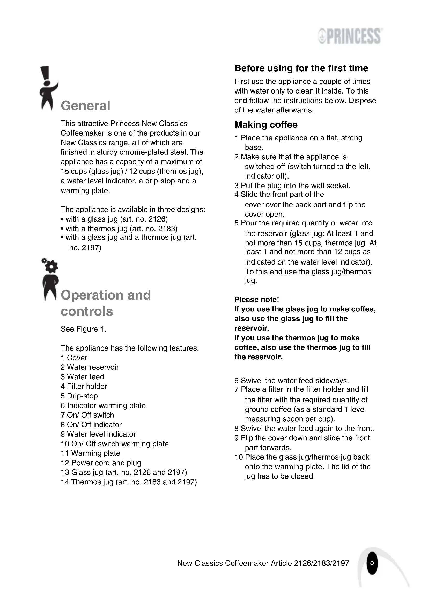 - with a glass jug and a thermos jug (art. no. 2197) Operation and controls See Figure 1. The appliance has the following features: 1 Cover 2 Water reservoir 3 Water feed 4 Filter holder 5 Drip-stop 6 Indicator warming plate 7 On/ Off switch 8 On/ Off indicator 9 Water level indicator 10 On/ Off switch warming plate 11 Warming plate 12 Power cord and plug 13 Glass jug (art. no. 2126 and 2197) 14 Thermos jug (art. no. 2183 and 2197) Before using for the first time First use the appliance a couple of times with water only to clean it inside. To this end follow the instructions below. Dispose of the water afterwards. Making coffee 1 Place the appliance on a flat, strong base. 2 Make sure that the appliance is switched off (switch turned to the left, indicator off). 3 Put the plug into the wall socket. 4 Slide the front part of the cover over the back part and flip the cover open. 5 Pour the required quantity of water into the reservoir (glass jug: At least 1 and not more than 15 cups, thermos jug: At least 1 and not more than 12 cups as indicated on the water level indicator). To this end use the glass jug/thermos jug. Please note! If you use the glass jug to make coffee, also use the glass jug to fill the reservoir. If you use the thermos jug to make coffee, also use the thermos jug to fill the reservoir. 6 Swivel the water feed sideways. 7 Place a filter in the filter holder and fill the filter with the required quantity of ground coffee (as a standard 1 level measuring spoon per cup). 8 Swivel the water feed again to the front. 9 Flip the cover down and slide the front part forwards. 10 Place the glass jug/thermos jug back onto the warming plate. The lid of the jug has to be closed.6 New Classics Coffeemaker Article 2126/2183/2197 Please note! Thermos jug: place the feet on the bottom of the jug into the recesses on the plate. Glass jug: place the jug firmly on the warming plate. 11 Switch the appliance on (turn the switch to the right). The On/Off indicator and the indicator for the warming plate will light up. The coffee is being made. The warming plate will keep the coffee on temperature. Note: When using the thermos jug, the warming plate will be switched off as soon as the coffee is made. The warming plate indicator will go out. 12 Remove the glass jug/thermos jug from the warming plate to pour a cup of coffee. The appliance has a drip-stop. So it is not necessary to wait for the coffee to percolate fully through before you remove the jug from the warming plate. 13 After use switch the appliance off (turn the switch to the left) and remove the plug from the wall socket. Maintenance and cleaning