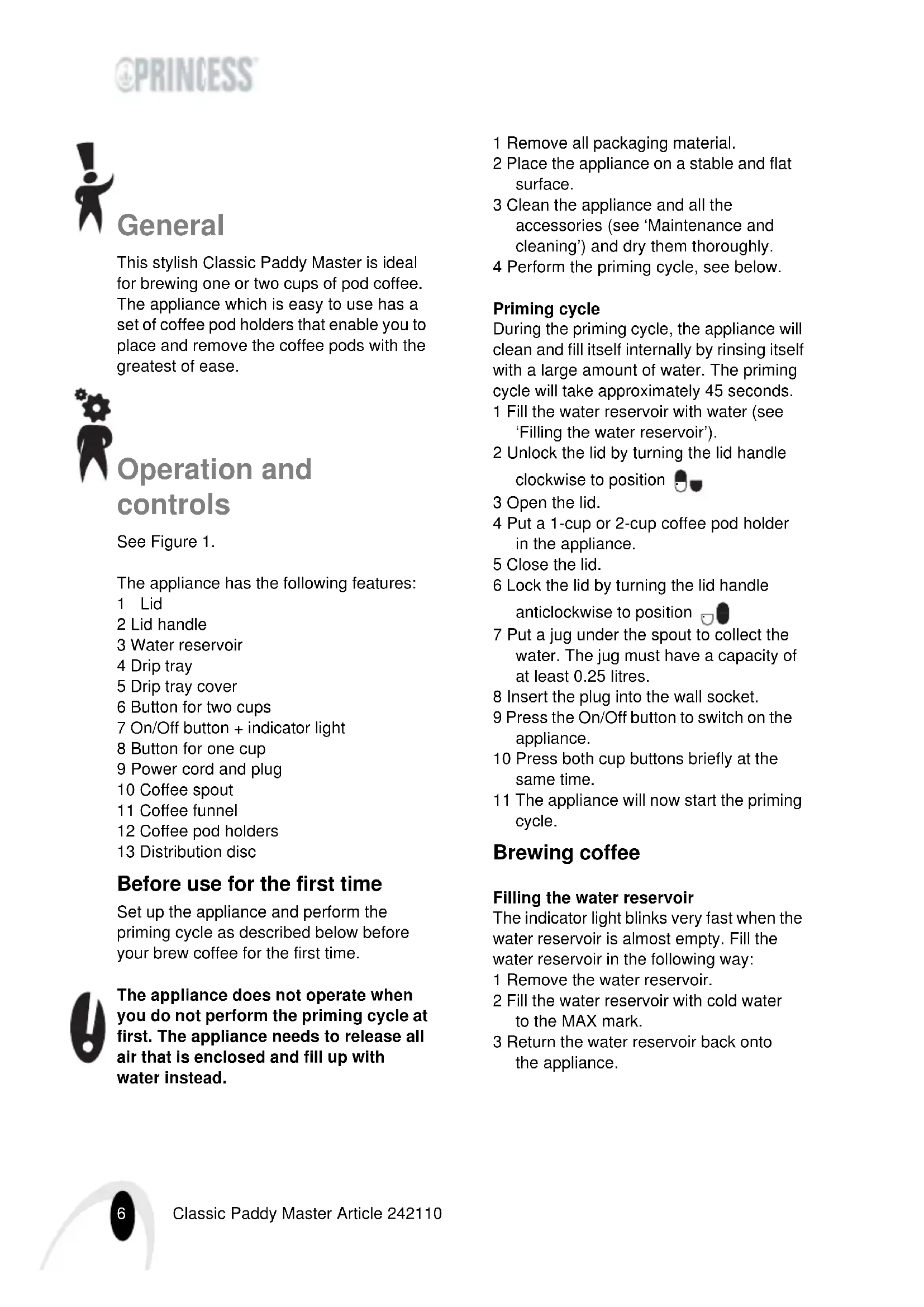 - 2002/96/EC Princess_Classic_Paddy_Master_242110.book Page 5 Thursday, November 1, 2007 2:19 PM6 Classic Paddy Master Article 242110 General This stylish Classic Paddy Master is ideal for brewing one or two cups of pod coffee. The appliance which is easy to use has a set of coffee pod holders that enable you to place and remove the coffee pods with the greatest of ease. Operation and controls See Figure 1. The appliance has the following features: 1Lid 2 Lid handle 3 Water reservoir 4 Drip tray 5 Drip tray cover 6 Button for two cups 7 On/Off button + indicator light 8 Button for one cup 9 Power cord and plug 10 Coffee spout 11 Coffee funnel 12 Coffee pod holders 13 Distribution disc Before use for the first time Set up the appliance and perform the priming cycle as described below before your brew coffee for the first time. The appliance does not operate when you do not perform the priming cycle at first. The appliance needs to release all air that is enclosed and fill up with water instead. 1 Remove all packaging material. 2 Place the appliance on a stable and flat surface. 3 Clean the appliance and all the accessories (see ‘Maintenance and cleaning’) and dry them thoroughly. 4 Perform the priming cycle, see below. Priming cycle During the priming cycle, the appliance will clean and fill itself internally by rinsing itself with a large amount of water. The priming cycle will take approximately 45 seconds. 1 Fill the water reservoir with water (see ‘Filling the water reservoir’). 2 Unlock the lid by turning the lid handle clockwise to position . 3 Open the lid. 4 Put a 1-cup or 2-cup coffee pod holder in the appliance. 5 Close the lid. 6 Lock the lid by turning the lid handle anticlockwise to position . 7 Put a jug under the spout to collect the water. The jug must have a capacity of at least 0.25 litres. 8 Insert the plug into the wall socket. 9 Press the On/Off button to switch on the appliance. 10 Press both cup buttons briefly at the same time. 11 The appliance will now start the priming cycle. Brewing coffee Filling the water reservoir The indicator light blinks very fast when the water reservoir is almost empty. Fill the water reservoir in the following way: 1 Remove the water reservoir. 2 Fill the water reservoir with cold water to the MAX mark. 3 Return the water reservoir back onto the appliance. Princess_Classic_Paddy_Master_242110.book Page 6 Thursday, November 1, 2007 2:19 PM7 Classic Paddy Master Article 242110 Brewing coffee