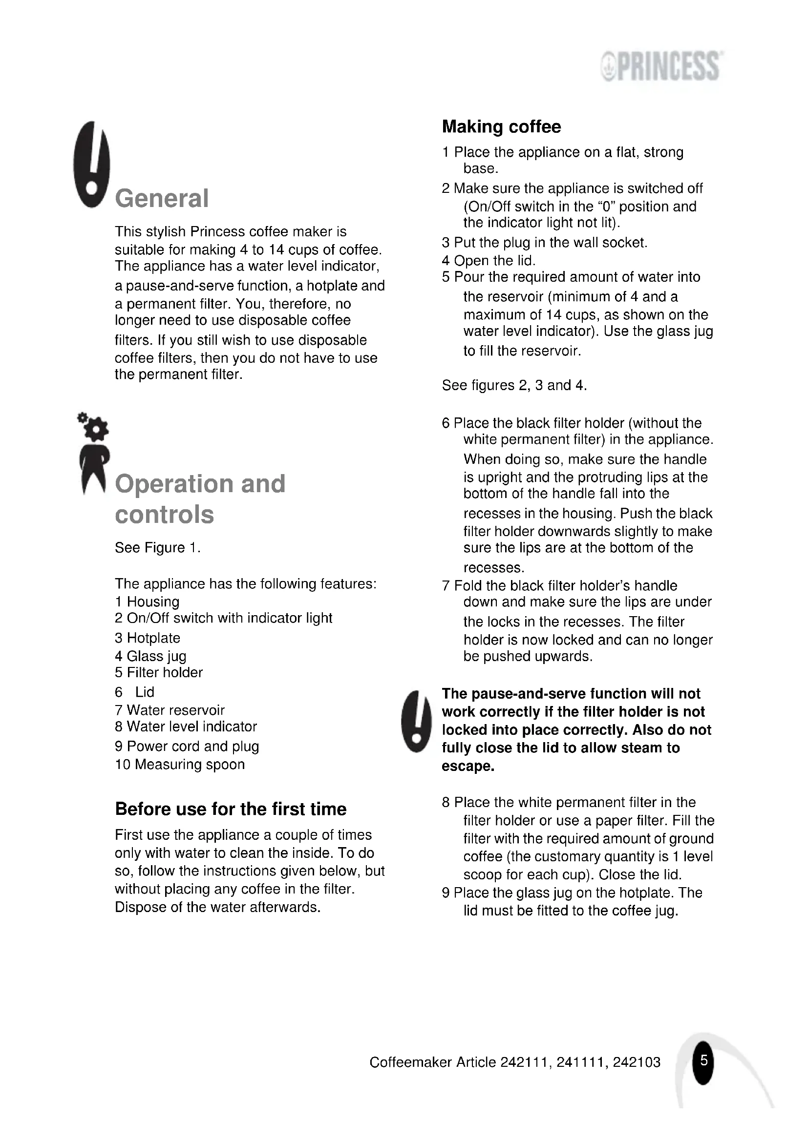 - Only use accessories recommended by the supplier. The use of other accessories may result in damage to the appliance, thereby creating hazards for the user.7 Coffeemaker Article 242111, 241111, 242103 Electricity and heat