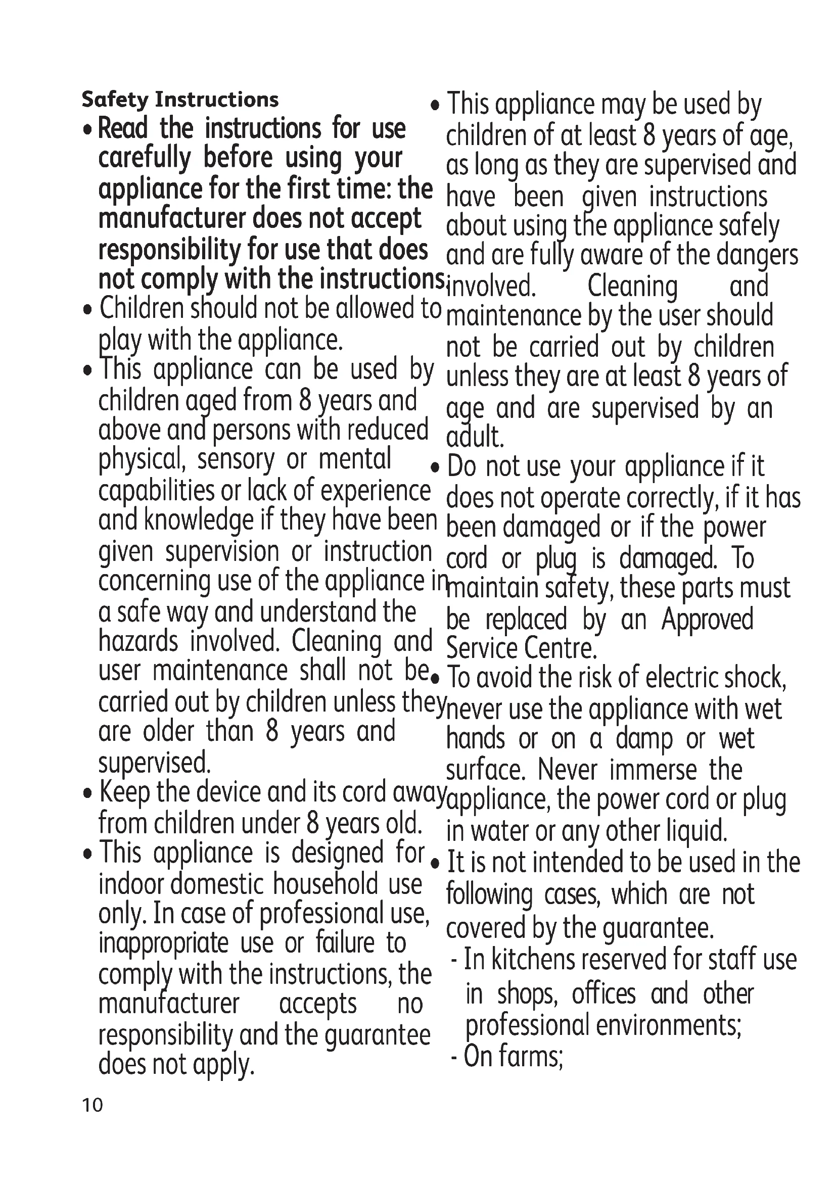 - This appliance may be used by children of at least 8 years of age, as long as they are supervised and have been given instructions about using the appliance safely and are fully aware of the dangers involved. Cleaning and maintenance by the user should not be carried out by children unless they are at least 8 years of age and are supervised by an adult.