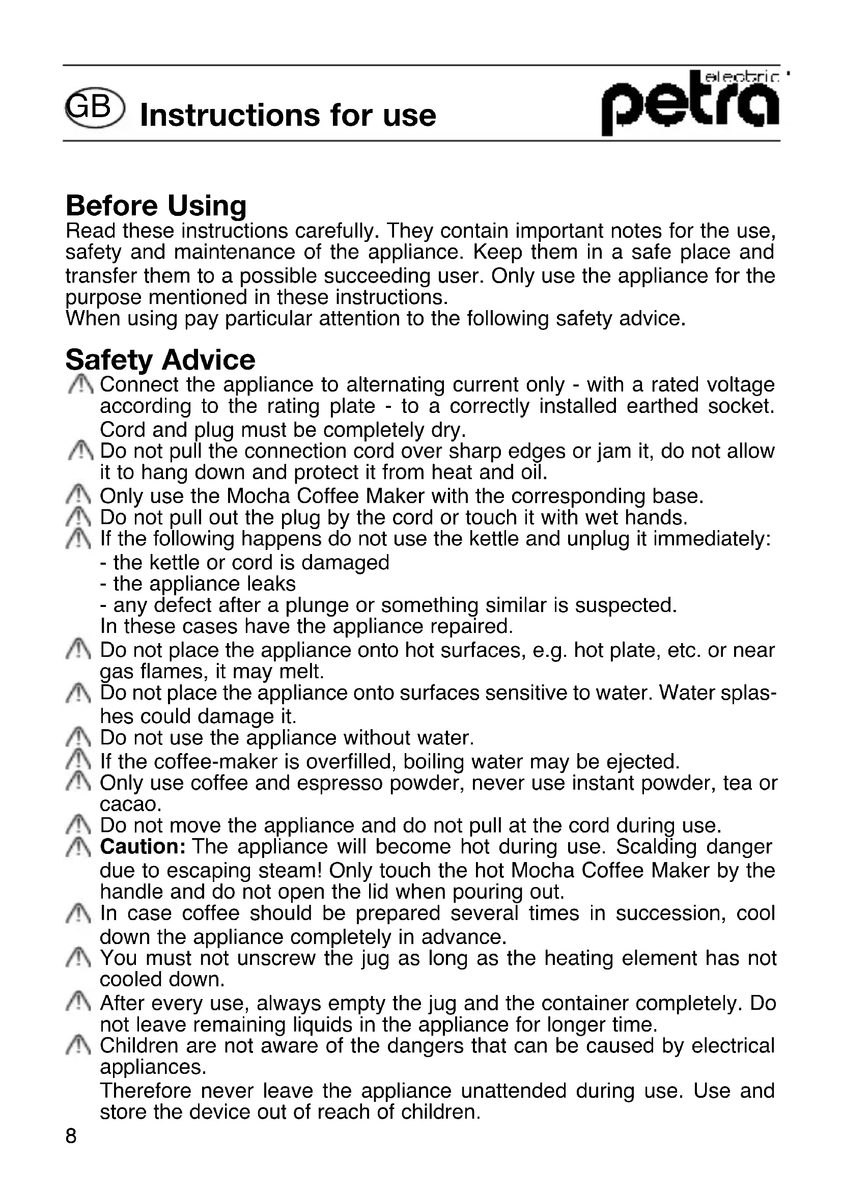 Download the instructions for your Coffee machine in PDF format for free! Find your manual MC 4 - Petra Electric and take your electronic device back in hand. On this page are published all the documents necessary for the use of your device. MC 4 by Petra Electric.