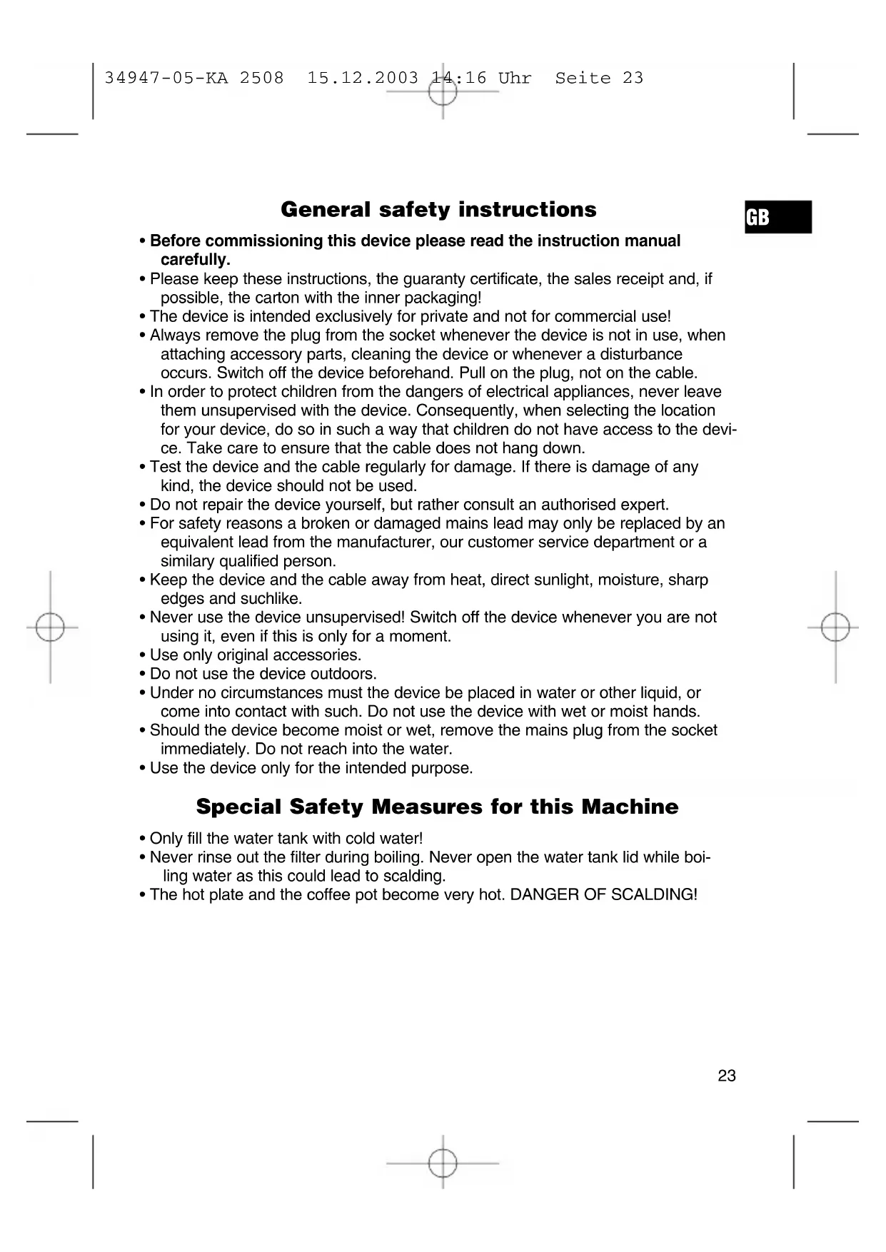 34947-05-KA 2508 15.12.2003 14:16 Uhr Seite 24Warranty We undertake to guarantee the appliance sold by our company for 12 months as of the date of purchase (cash receipt). During the life of the warranty we shall provide for the repair or replacement of the appliance owing to material or manufacturing defects absolutely free of charge. Proof for the warranty is provided by the purchase document. The replacement and repair will not be performed free of charge without this proof of purchase. Should the warranty be valid, please consign the complete appliance in its original packing together with the cash receipt to your local dealer. You are not entitled to the replacement of the appliance owing to broken glass parts and faulty accessories. However, said parts will be replaced free of charge. In this case only the faulty accessory needs to be ordered without sending back the whole appliance! The cleaning, servicing and replacement of wear parts are not covered by this war- ranty and hence are to be paid for. The warranty is terminated in case of handling on the part of Third parties. After the warranty Once the warranty has expired, repairs can be carried out by specialized technici- ans or repair services against the payment of the service.