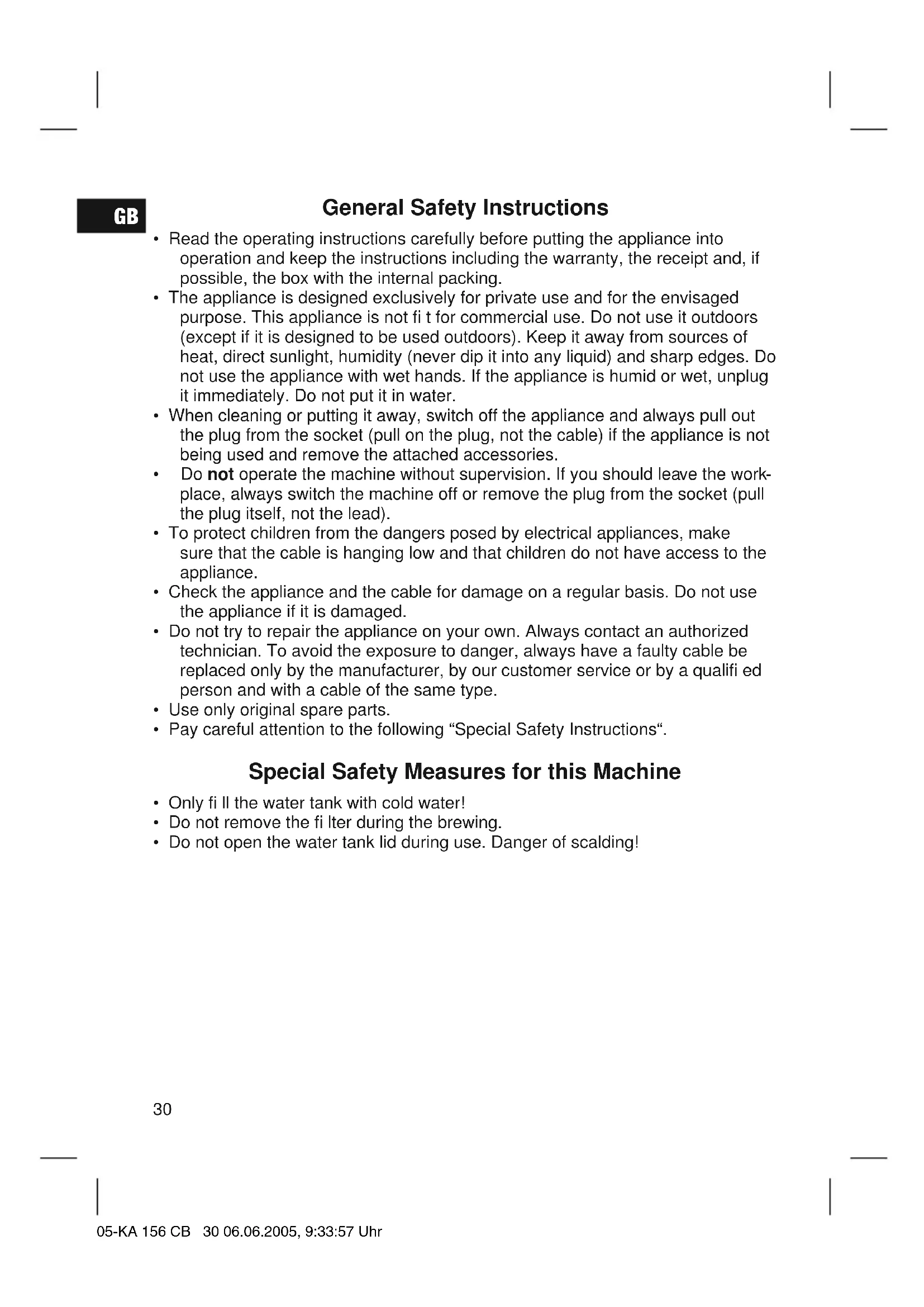 - Do not open the water tank lid during use. Danger of scalding! 05-KA 156 CB 30 06.06.2005, 9:33:57 UhrGB