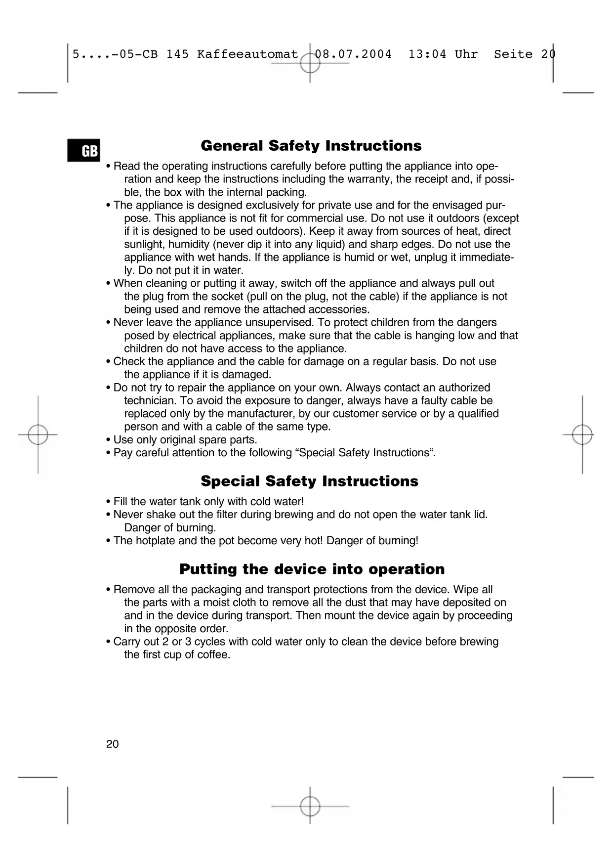 5....-05-CB 145 Kaffeeautomat 08.07.2004 13:04 Uhr Seite 21This appliance conforms with the CE directives for radio interference suppression and low-voltage safety and has been built to meet current safety requirements. Subject to technical changes without prior notice! Guarantee We undertake to guarantee the appliance sold by our company for 24 months as of the date of purchase (cash receipt). During the life of the warranty we shall provide for the repair or replacement of the appliance owing to material or manufacturing defects absolutely free of charge. Proof for the warranty is provided by the purchase document. The replacement and repair will not be performed free of charge without this proof of purchase. Should the warranty be valid, please consign the complete appliance in its original packing together with the cash receipt to your local dealer. You are not entitled to the replacement of the appliance owing to broken glass parts and faulty accessories. However, said parts will be replaced free of charge. In this case only the faulty accessory needs to be ordered without sending back the whole appliance! The cleaning, servicing and replacement of wear parts are not covered by this war- ranty and hence are to be paid for. The warranty is terminated in case of handling on the part of Third parties. After the expiry of the guarantee Once the warranty has expired, repairs can be carried out by specialized technici- ans or repair services against the payment of the service.