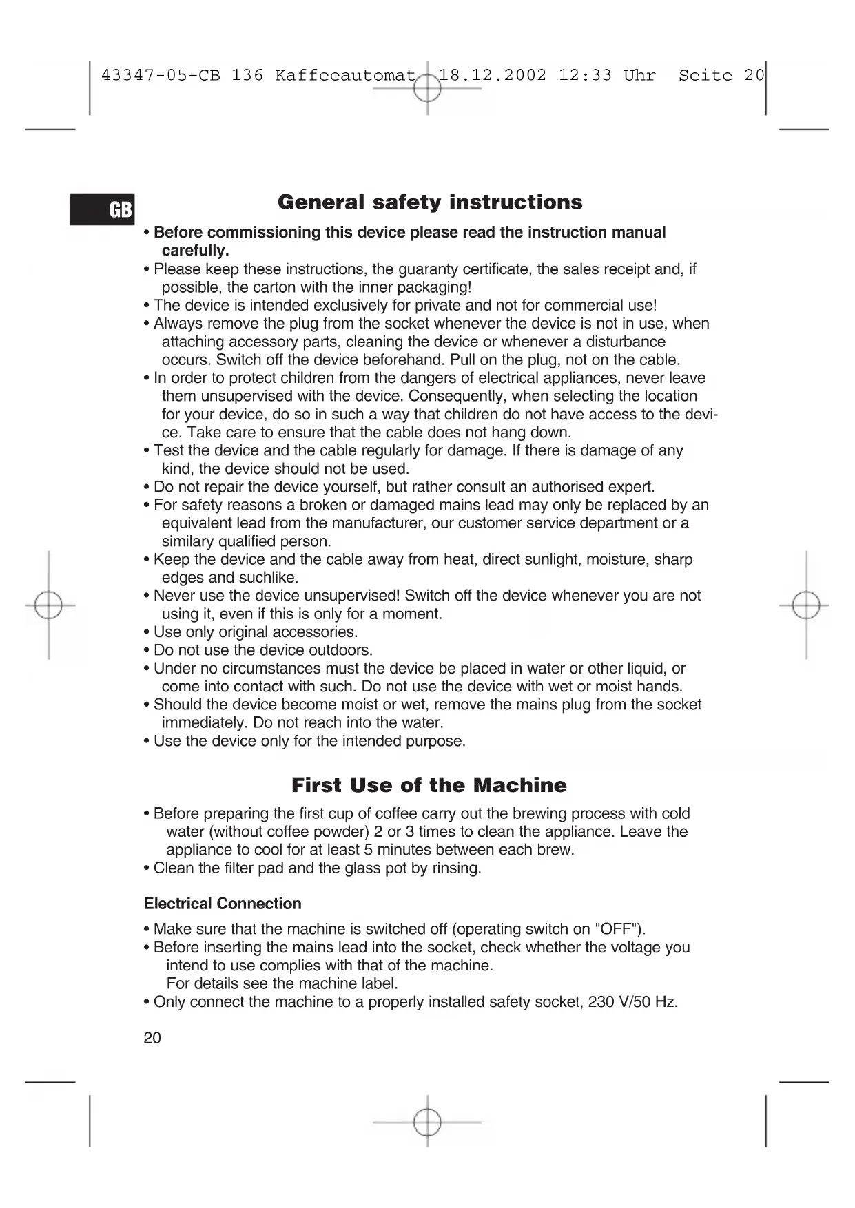 the hotplate when the can is removed. Put the can back into place and the stop is activated again. If you wish to keep the remaining warm, the switch must be left in the I position. The hotplate keeps the coffee warm until the switch is shifted to O. Switching Off The machine is switched off when the switch is in the O position. (The LED in the switch is off.) Descaling In order to extend the service life of the appliance, it is highly recommended to decalcify the appliance on a regular basis. The decalcification is necessary if the brewing time increases substantially. Use only a commercially available citrus acid- based decalcifier. Cleaning Before cleaning the machine you should always remove the mains lead and wait until the machine has cooled down. The machine should only be cleaned with a slightly damp cloth. Remove the filter on the appliance by pulling the latch on the fil- ter insert. The coffee pot and the filter pad should be cleaned by rinsing in cold water. This appliance conforms with the CE directives for radio interference suppression and low-voltage safety and has been built to meet current safety requirements. Subject to technical changes without prior notice!