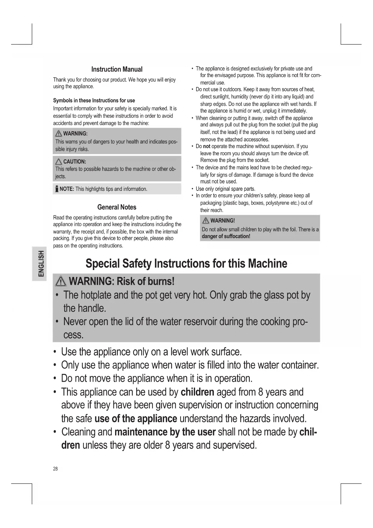 - In order to ensure your children’s safety, please keep all packaging (plastic bags, boxes, polystyrene etc.) out of their reach. WARNING! Do not allow small children to play with the foil. There is a danger of suffocation! Instruction Manual Thank you for choosing our product. We hope you will enjoy using the appliance. Symbols in these Instructions for use Important information for your safety is specially marked. It is essential to comply with these instructions in order to avoid accidents and prevent damage to the machine:
