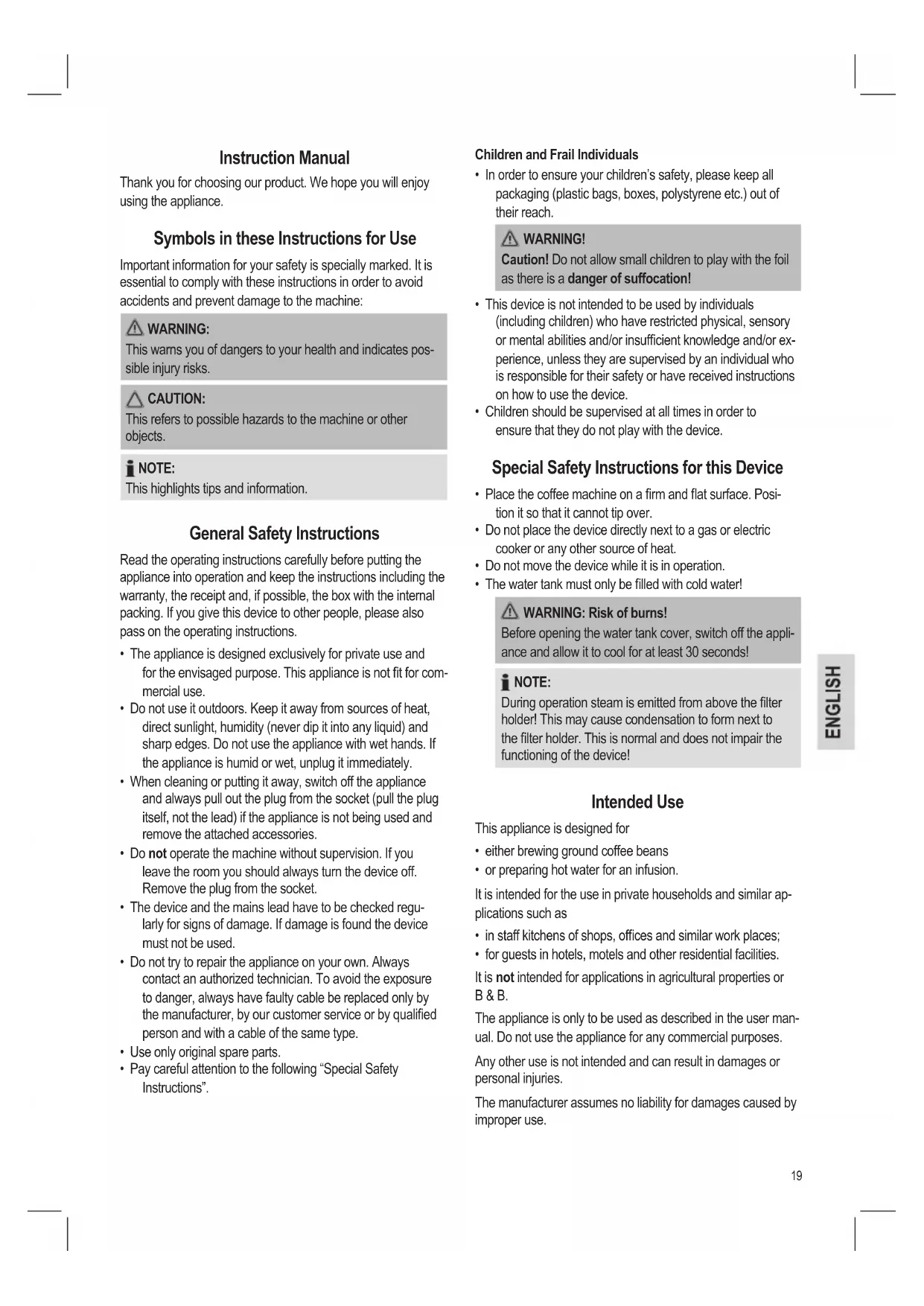 - for guests in hotels, motels and other residential facilities. It is not intended for applications in agricultural properties or B & B. The appliance is only to be used as described in the user man- ual. Do not use the appliance for any commercial purposes. Any other use is not intended and can result in damages or personal injuries. The manufacturer assumes no liability for damages caused by improper use. Instruction Manual Thank you for choosing our product. We hope you will enjoy using the appliance. Symbols in these Instructions for Use Important information for your safety is specially marked. It is essential to comply with these instructions in order to avoid accidents and prevent damage to the machine: