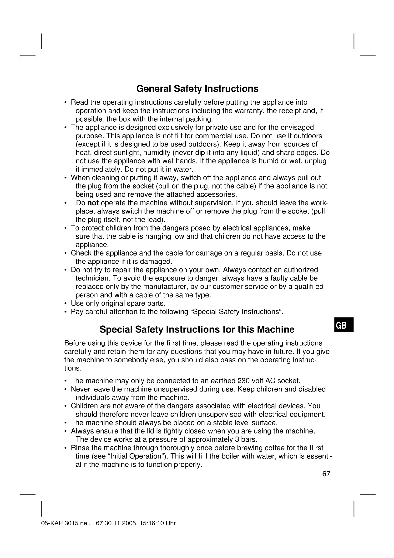 - Rinse the machine through thoroughly once before brewing coffee for the fi rst time (see “Initial Operation”). This will fi ll the boiler with water, which is essenti- al if the machine is to function properly. 05-KAP 3015 neu 67 30.11.2005, 15:16:10 UhrGB