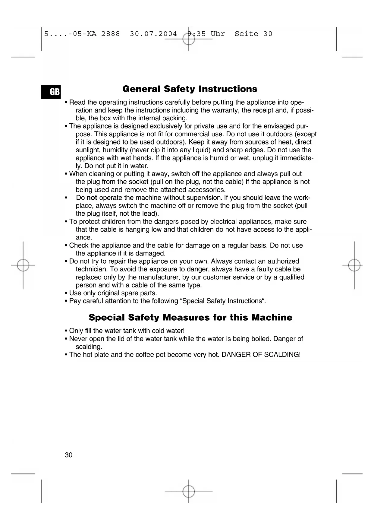 5....-05-KA 2888 30.07.2004 9:35 Uhr Seite 32This device has been tested according to all relevant current CE guidelines, such as electromagnetic compatibility and low voltage directives, and has been constructed in accordance with the latest safety regulations. Subject to technical changes without prior notice! Guarantee The device supplied by our Company is covered by a 24 month guarantee starting on the date of purchase (receipt). During the life of the guarantee any fault of the device or its accessories *) ascriba- ble to material or manufacturing defects will be eliminated free of charge by repai- ring or, at our discretion, by replacing it. The guarantee services do not entail an extension of the life of the guarantee nor do they give rise to any right to a new guarantee! Proof of the guarantee is provided by the proof of purchase. Without proof of purchase no free replacement or repair will be carried out. If you wish to make a claim under the guarantee please return the entire machine in the original packaging to your dealer together with the receipt. *) Damage to accessories does not mean automatic free replacement of the whole machine. In such cases please contact our hotline. Broken glass or breakage of plastic parts are always subject to a charge. Defects to consumables or parts subject to wearing (e.g. motor pistons, kneading blades, drive shafts, spare remote control, spare toothbrushes, saw blades, etc.) as well as cleaning, maintenance or the replacement of said parts are not covered by the guarantee and hence are to be paid! The guarantee lapses in case of unauthorized tampering. After the expiry of the guarantee After the expiry of the guarantee repairs can be carried by the competent dealer or repair service against the payment of the ensuing costs.