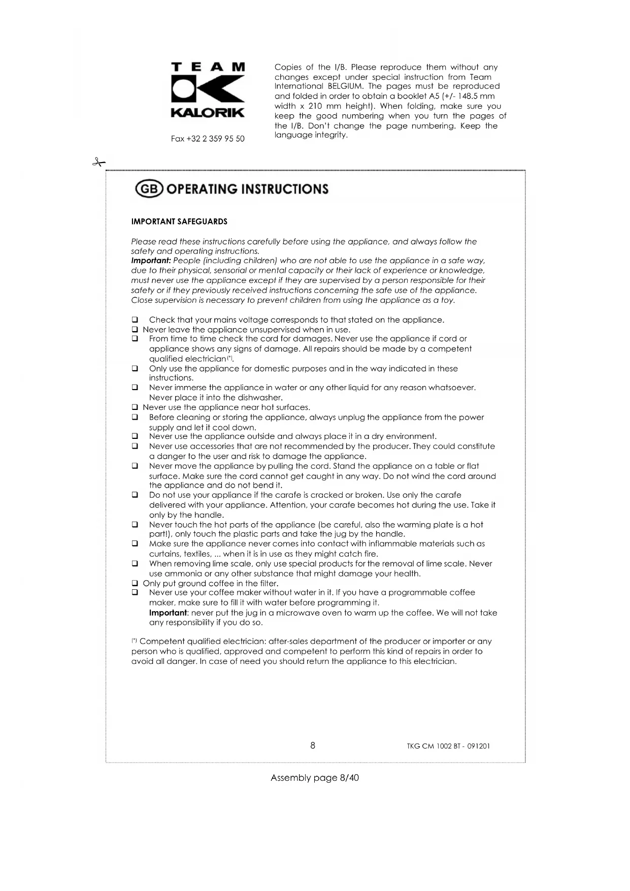 To programme your coffee maker to brew fresh coffee at a preset time, first follow steps 1 to 7 in the “PREPARATION OF COFFEE” section. Make sure the coffee maker’s clock is set to the right time. Press the PROGRAMME button twice. The clock will now display 12:00. Use the HOUR and MIN buttons to set the desired brew time. Once the setting is finished, wait about 3 seconds or press once the PROGRAMME button. In both cases the programming time will disappear and will be replaced by the clock time. Press the on-off switch (0/I) once to activate the preset brew cycle. The red AUTO light will illuminate when the brew time is properly set. When your preset brew time is reached and the coffee maker starts its brew cycle, the AUTO light will go out and the red pilot light of the on-off switch will illuminate. As with the regular brew cycle, an automatic one-hour keep-warm cycle will commence after your coffee maker has finished brewing. When the hour is over, the coffee maker will automatically shut itself off. Note: to check the programming time after you have set it, press the PROGRAMME button and it will be displayed. USE COMFORT If you use the aroma function, the water flow will be slower which will give your coffee extra flavour. When you remove the carafe from this appliance, a non-drip valve will automatically operate to stop any drops of coffee dripping onto the hotplate. Replacement of the carafe automatically opens the non-drip valve and allows any remaining coffee to filter through into the carafe. When the water tank is empty, wait a few seconds before removing the carafe in order to let the water in the filter flow totally. Once the coffee ready, you can keep it warm by letting it on the hotplate. This will start to heat up as soon as the coffee maker is on (red pilot light of the on-off switch on). With the automatic or the manual operation, the duration won’t exceed about 1 hour because your coffee maker will switch off automatically after that. Never put an (almost) empty jug back on the hotplate when the latter is still hot. Caution: when you switch your coffee maker off, the hotplate will also switch off, but it will still stay hot for a short while. So pay attention and wait until the hotplate has completely cooled down before cleaning or storing the appliance. Copies of the I/B. Please reproduce them without any changes except under special instruction from Team International BELGIUM. The pages must be reproduced and folded in order to obtain a booklet A5 (+/- 148.5 mm width x 210 mm height). When folding, make sure you keep the good numbering when you turn the pages of the I/B. Don’t change the page numbering. Keep the language integrity.