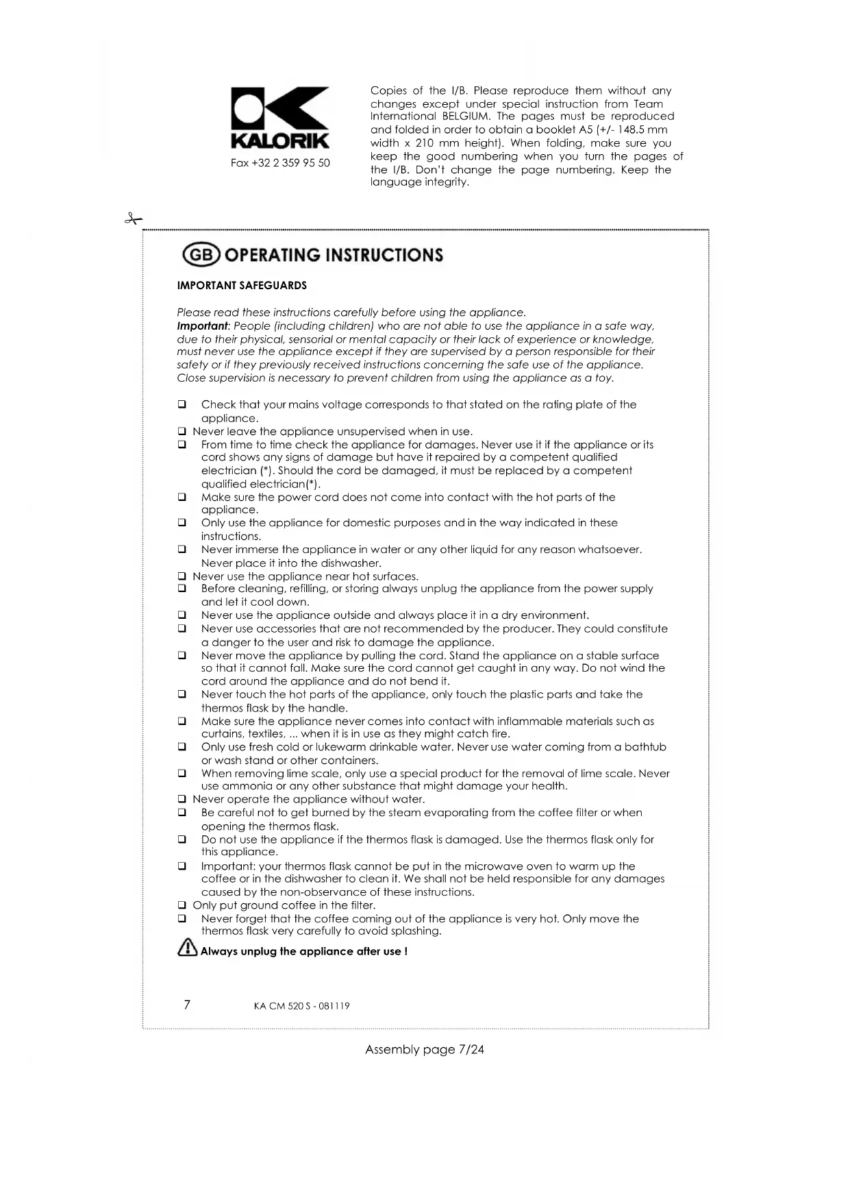 Fax +32 2 359 95 50 Copies of the I/B. Please reproduce them without any changes except under special instruction from Team International BELGIUM. The pages must be reproduced and folded in order to obtain a booklet A5 (+/- 148.5 mm width x 210 mm height). When folding, make sure you keep the good numbering when you turn the pages of the I/B. Don’t change the page numbering. Keep the language integrity. 3 KA CM 520 S - 081119
