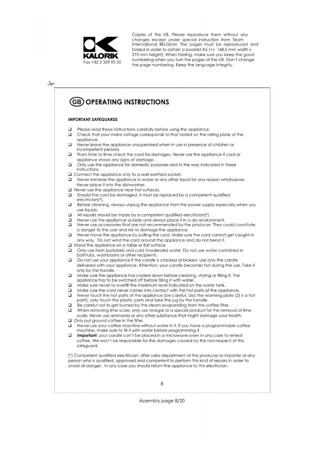 Generated by Unregistered Batch DOC TO PDF Converter 2011.3.804.1511, please register! Copies of the I/B. Please reproduce them without any changes except under special instruction from Team International BELGIUM. The pages must be reproduced and folded in order to obtain a booklet A5 (+/- 148.5 mm width x 210 mm height). When folding, make sure you keep the good numbering when you turn the pages of the I/B. Don‟t change the page numbering. Keep the language integrity. Front cover page (first page) Assembly page 1/20