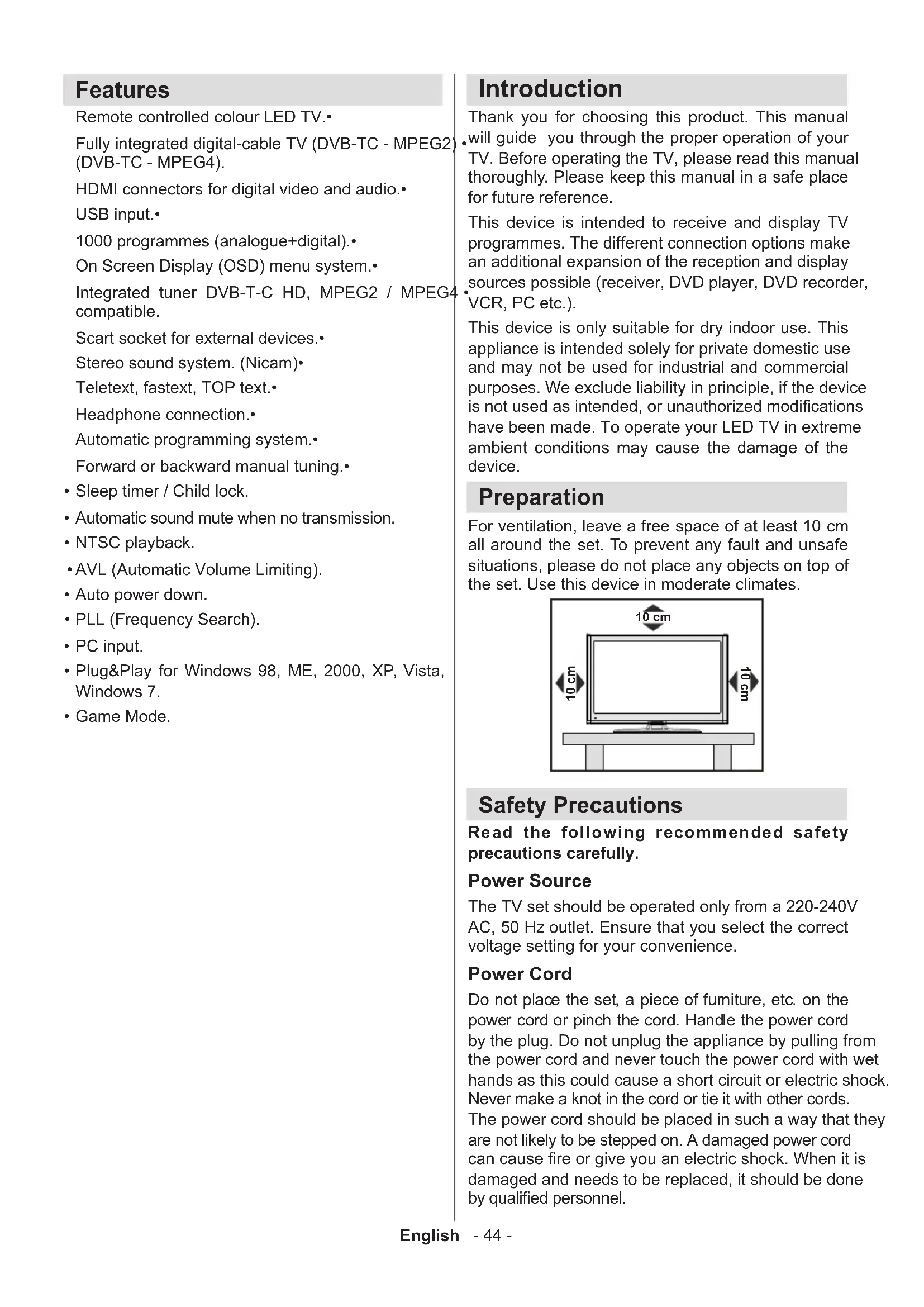 Remote Control LED TV Instruction Book Batteries: 2 X AAA 1 X Video & Audio Connection Cable Note: You should check the contents after opening your purchase and make sure that every item is included. TRADEMARK ACKNOWLEDGMENT “Dolby” and the double-D symbol are trademarks of Dolby Laboratories. Licence Notication (Optional) Manufactured under license from Dolby Laboratories. Electrical devices not in the hands of children Never let children use electrical devices unsupervised. Children cannot always recognize properly any possible danger. Batteries / accumulators can be life threatening when swallowed. Store batteries out of the reach of small children. In case of swallowing a battery, medical aid has to be sought immediately. Also keep the packaging away from children as there is danger of suffocation. Note:The HDMI connection between PC and TV may cause radio interference in which case it is recommended to use VGA(DSUB-15) connection. The Standby button does not fully switch off this product. Moreover, the device continues to consume power in standby mode. In order to separate the device completely from mains, the mains plug has to be pulled from the mains socket. Because of that the device should be set up in a way, that an unobstructed access to the mains socket is guaranteed, so that in case of emergency the mains plug can be pulled immediately. During periods of prolonged non-use, the TV should be disconnected from the mains power supply.English - 47 - Environmental Information This television is designed to consume less energy to save the environment. • You not only help to save the environment but you can also save money by reducing electricity bills thanks to the energy efciency features of this TV. To reduce energy consumption, you should take the following steps: You can use the Power Save Mode setting, located in the Picture Settings menu. If you set the Power Save • Mode as On, the TV will switch to energy-saving mode and the luminance level of the TV set will be decreased to optimum level. Note that some picture settings will be unavailable when the TV is in Power Save Mode. When the TV is not in use, please switch off or disconnect the TV from the mains plug. This will also reduce • energy consumption. Note that annually, using the TV set in Power Save Mode has more power efciency than disconnecting • the TV from the mains plug instead of keeping stand-by mode. Therefore it is highly recommended to activate Power Save Mode setting to reduce your annual power consumption. And also it is recommended to disconnect the TV from the mains plug to save energy more when you do not use.