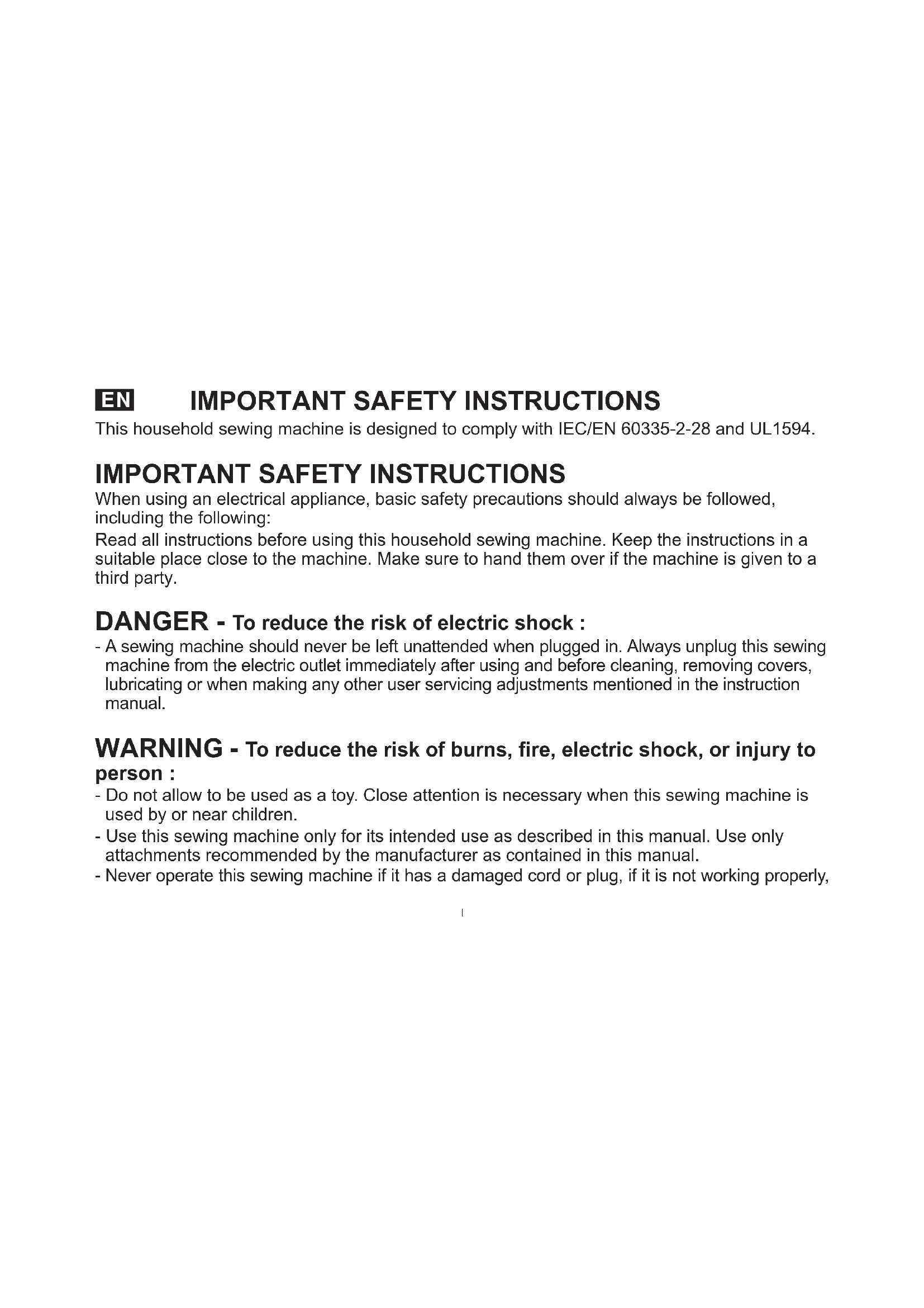 Manuel d'Instruction Instruction Manuall This household sewing machine is designed to comply with IEC/EN 60335-2-28 and UL1594. When using an electrical appliance, basic safety precautions should always be followed, including the following: Read all instructions before using this household sewing machine. Keep the instructions in a suitable place close to the machine. Make sure to hand them over if the machine is given to a third party. - A sewing machine should never be left unattended when plugged in. Always unplug this sewing machine from the electric outlet immediately after using and before cleaning, removing covers,lubricating or when making any other user servicing adjustments mentioned in the instructionmanual. - Do not allow to be used as a toy. Close attention is necessary when this sewing machine is used by or near children. - Use this sewing machine only for its intended use as described in this manual. Use only attachments recommended by the manufacturer as contained in this manual. - Never operate this sewing machine if it has a damaged cord or plug, if it is not working properly,