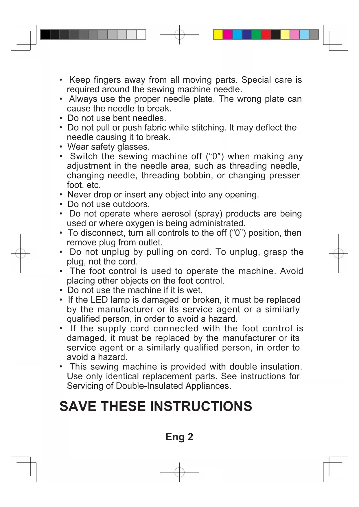 F-1 6660/6680/6699F-2 Eng 1 This household sewing machine is designed to comply with IEC/EN 60335-2-28 and UL1594. When using an electrical appliance, basic safety precautions should always be followed, including the following: Read all instructions before using this household sewing machine. Keep the instructions in a suitable place close to the machine. Make sure to hand them over if the machine is given to a third party.