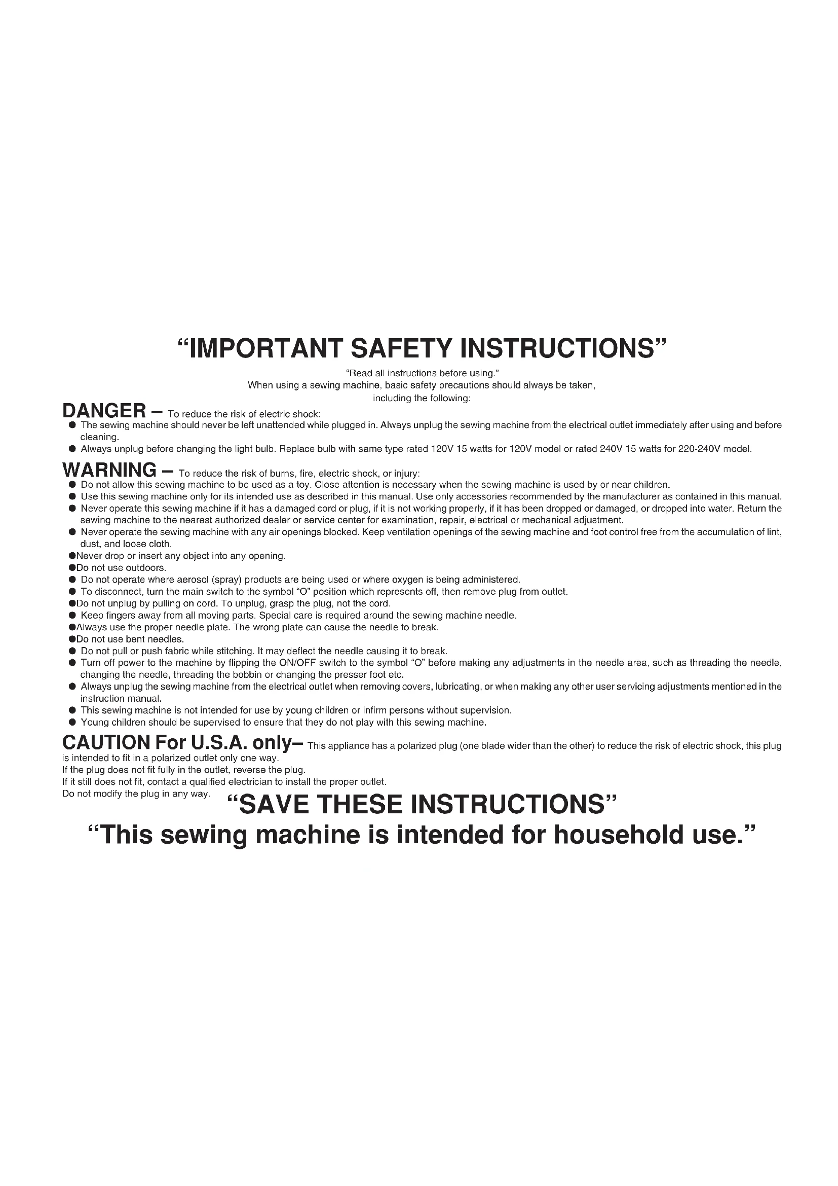 “This sewing machine is intended for household use.” DANGER – To reduce the risk of electric shock: ● The sewing machine should never be left unattended while plugged in. Always unplug the sewing machine from the electrical outlet immediately after using and before cleaning. ● Always unplug before changing the light bulb. Replace bulb with same type rated 120V 15 watts for 120V model or rated 240V 15 watts for 220-240V model. WARNING – To reduce the risk of burns, fire, electric shock, or injury: ● Do not allow this sewing machine to be used as a toy. Close attention is necessary when the sewing machine is used by or near children. ● Use this sewing machine only for its intended use as described in this manual. Use only accessories recommended by the manufacturer as contained in this manual. ● Never operate this sewing machine if it has a damaged cord or plug, if it is not working properly, if it has been dropped or damaged, or dropped into water. Return the sewing machine to the nearest authorized dealer or service center for examination, repair, electrical or mechanical adjustment. ● Never operate the sewing machine with any air openings blocked. Keep ventilation openings of the sewing machine and foot control free from the accumulation of lint, dust, and loose cloth. ● Never drop or insert any object into any opening. ● Do not use outdoors. ● Do not operate where aerosol (spray) products are being used or where oxygen is being administered. ● To disconnect, turn the main switch to the symbol “O” position which represents off, then remove plug from outlet. ● Do not unplug by pulling on cord. To unplug, grasp the plug, not the cord. ● Keep fingers away from all moving parts. Special care is required around the sewing machine needle. ● Always use the proper needle plate. The wrong plate can cause the needle to break. ● Do not use bent needles. ● Do not pull or push fabric while stitching. It may deflect the needle causing it to break. ● Turn off power to the machine by flipping the ON/OFF switch to the symbol “O” before making any adjustments in the needle area, such as threading the needle, changing the needle, threading the bobbin or changing the presser foot etc. ● Always unplug the sewing machine from the electrical outlet when removing covers, lubricating, or when making any other user servicing adjustments mentioned in the instruction manual. ● This sewing machine is not intended for use by young children or infirm persons without supervision. ● Young children should be supervised to ensure that they do not play with this sewing machine. CAUTION For U.S.A. only– This appliance has a polarized plug (one blade wider than the other) to reduce the risk of electric shock, this plug is intended to fit in a polarized outlet only one way. If the plug does not fit fully in the outlet, reverse the plug. If it still does not fit, contact a qualified electrician to install the proper outlet. Do not modify the plug in any way.