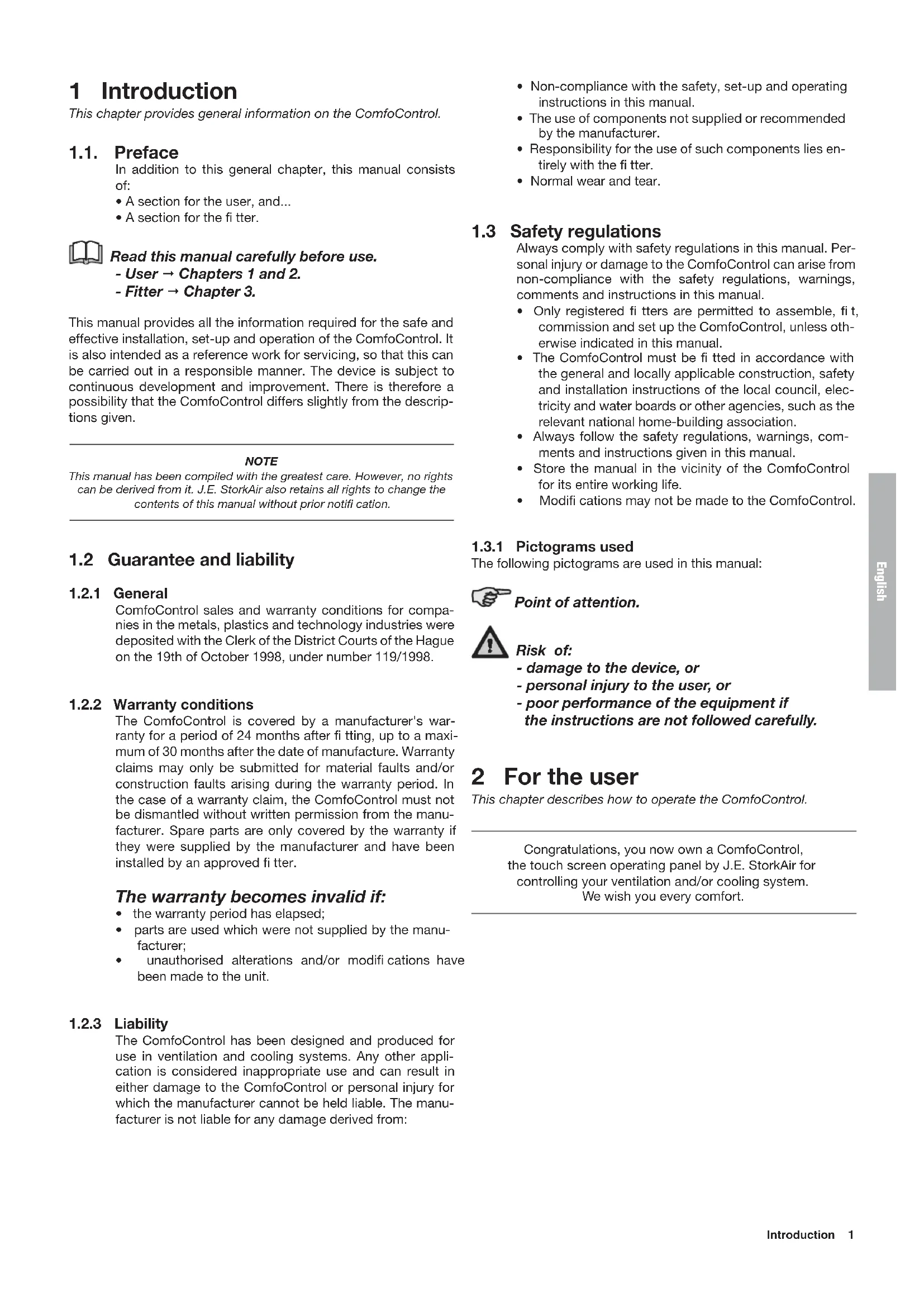 The following pictograms are used in this manual: Point of attention. Risk of: - damage to the device, or - personal injury to the user, or - poor performance of the equipment if the instructions are not followed carefully. 2 For the user This chapter describes how to operate the ComfoControl. Congratulations, you now own a ComfoControl, the touch screen operating panel by J.E. StorkAir for controlling your ventilation and/or cooling system. We wish you every comfort. English2