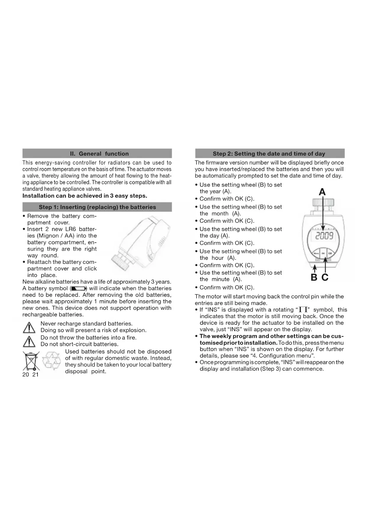 This energy-saving controller for radiators can be used to control room temperature on the basis of time. The actuator moves a valve, thereby allowing the amount of heat owing to the heat- ing appliance to be controlled. The controller is compatible with all standard heating appliance valves. Installation can be achieved in 3 easy steps. Step 1: Inserting (replacing) the batteries