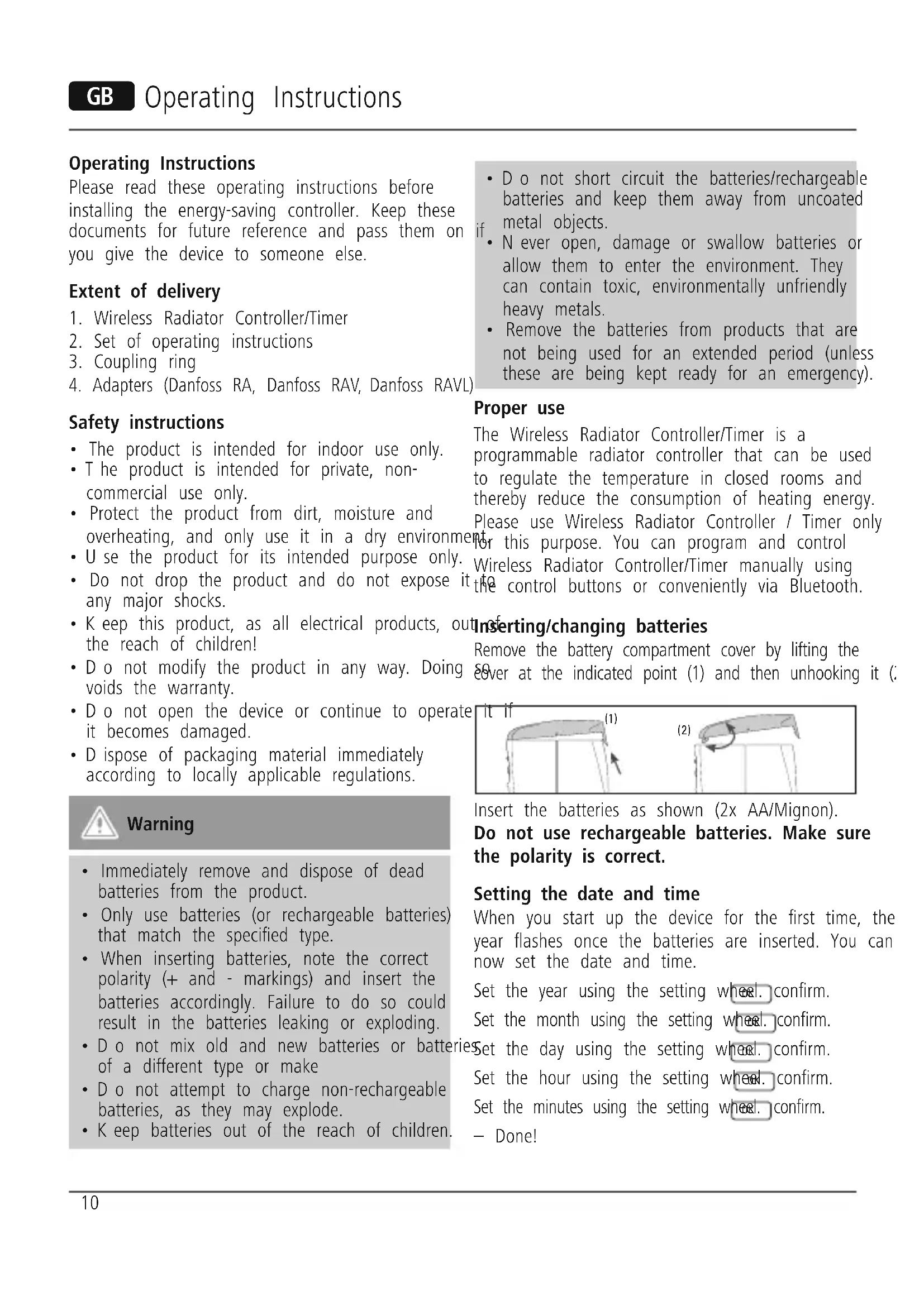 - Remove the batteries from products that are not being used for an extended period (unless these are being kept ready for an emergency). Proper use The Wireless Radiator Controller/Timer is a programmable radiator controller that can be used to regulate the temperature in closed rooms and thereby reduce the consumption of heating energy. Please use Wireless Radiator Controller / Timer only for this purpose. You can program and control Wireless Radiator Controller/Timer manually using the control buttons or conveniently via Bluetooth. Inserting/changing batteries Remove the battery compartment cover by lifting the cover at the indicated point (1) and then unhooking it (2). (2) (1) Insert the batteries as shown (2x AA/Mignon). Do not use rechargeable batteries. Make sure the polarity is correct. Setting the date and time When you start up the device for the rst time, the year ashes once the batteries are inserted. You can now set the date and time. Set the year using the setting wheel.
