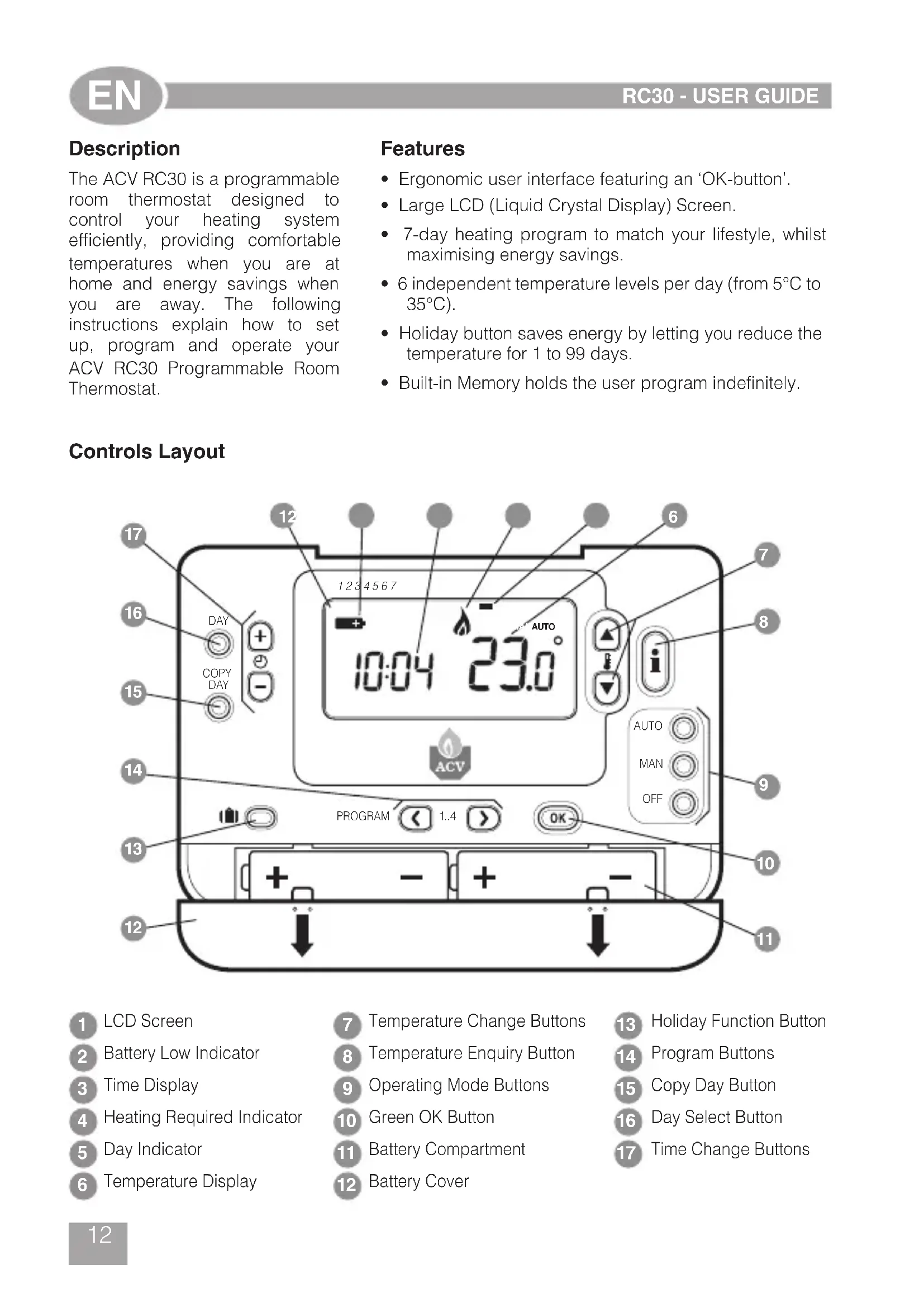 The ACV RC30 is a programmable room thermostat designed to control your heating system efficiently, providing comfortable temperatures when you are at home and energy savings when you are away. The following instructions explain how to setup, program and operate your ACV RC30 Programmable Room Thermostat.