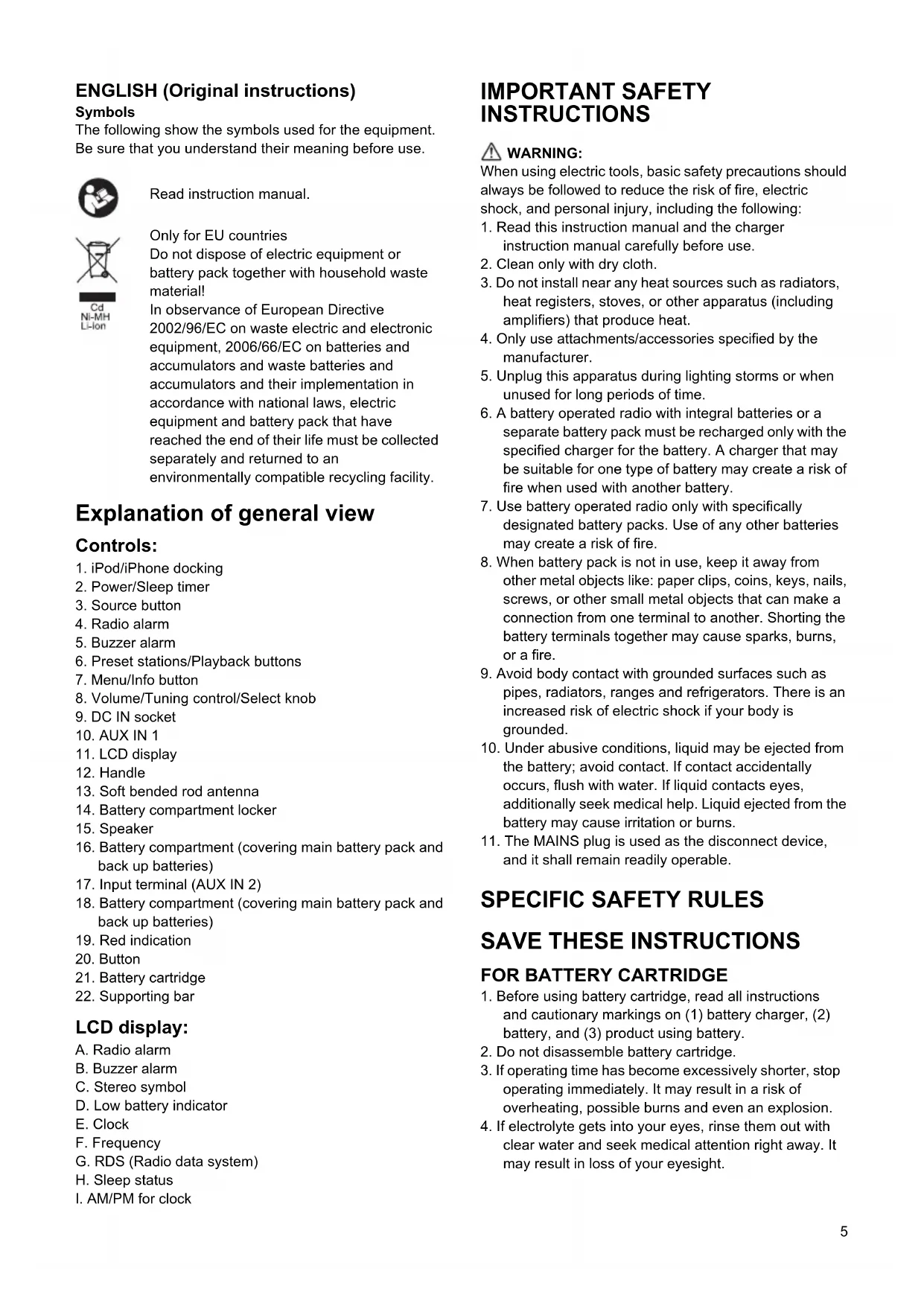 clear water and seek medical attention right away. It may result in loss of your eyesight. Read instruction manual. Only for EU countries Do not dispose of electric equipment or battery pack together with household waste material! In observance of European Directive 2002/96/EC on waste electric and electronic equipment, 2006/66/EC on batteries and accumulators and waste batteries and accumulators and their implementation in accordance with national laws, electric equipment and battery pack that have reached the end of their life must be collected separately and returned to an environmentally compatible recycling facility.6