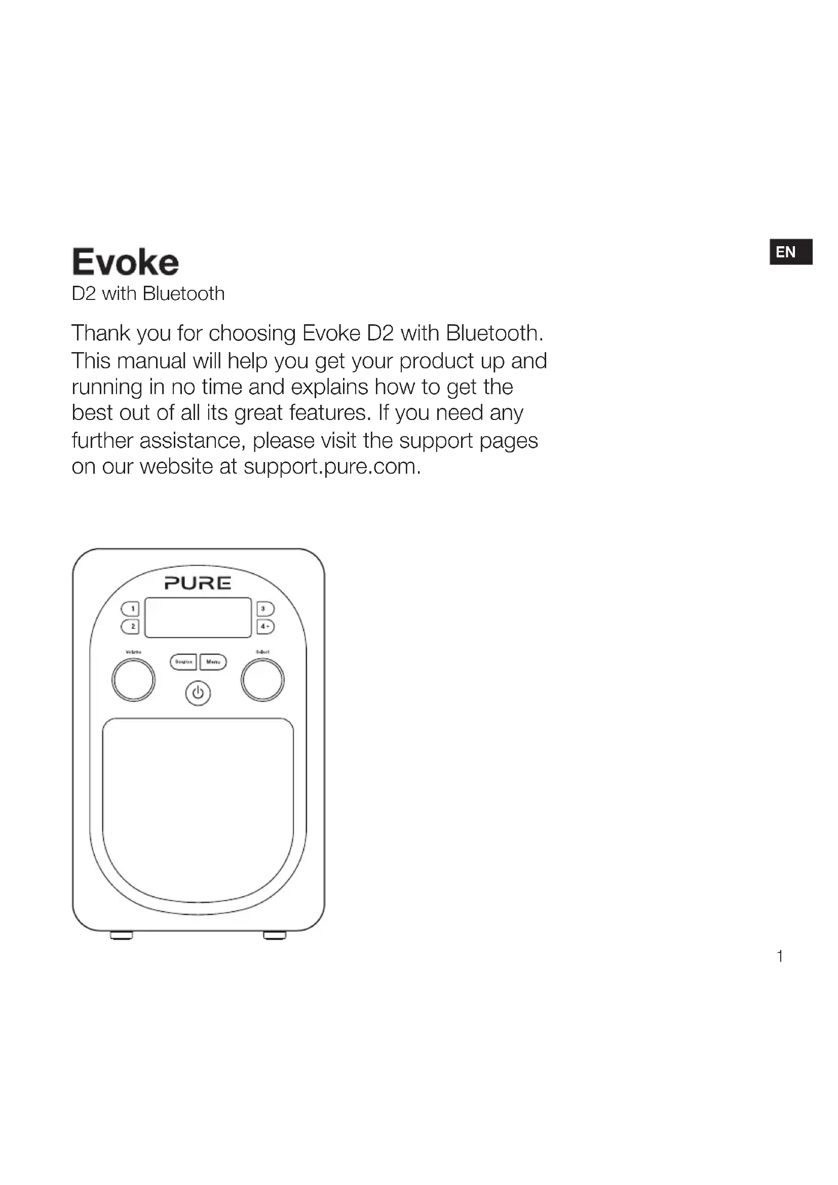 D2 with Bluetooth Thank you for choosing Evoke D2 with Bluetooth. This manual will help you get your product up and running in no time and explains how to get the best out of all its great features. If you need any further assistance, please visit the support pages on our website at support.pure.com. DA2 Safety information