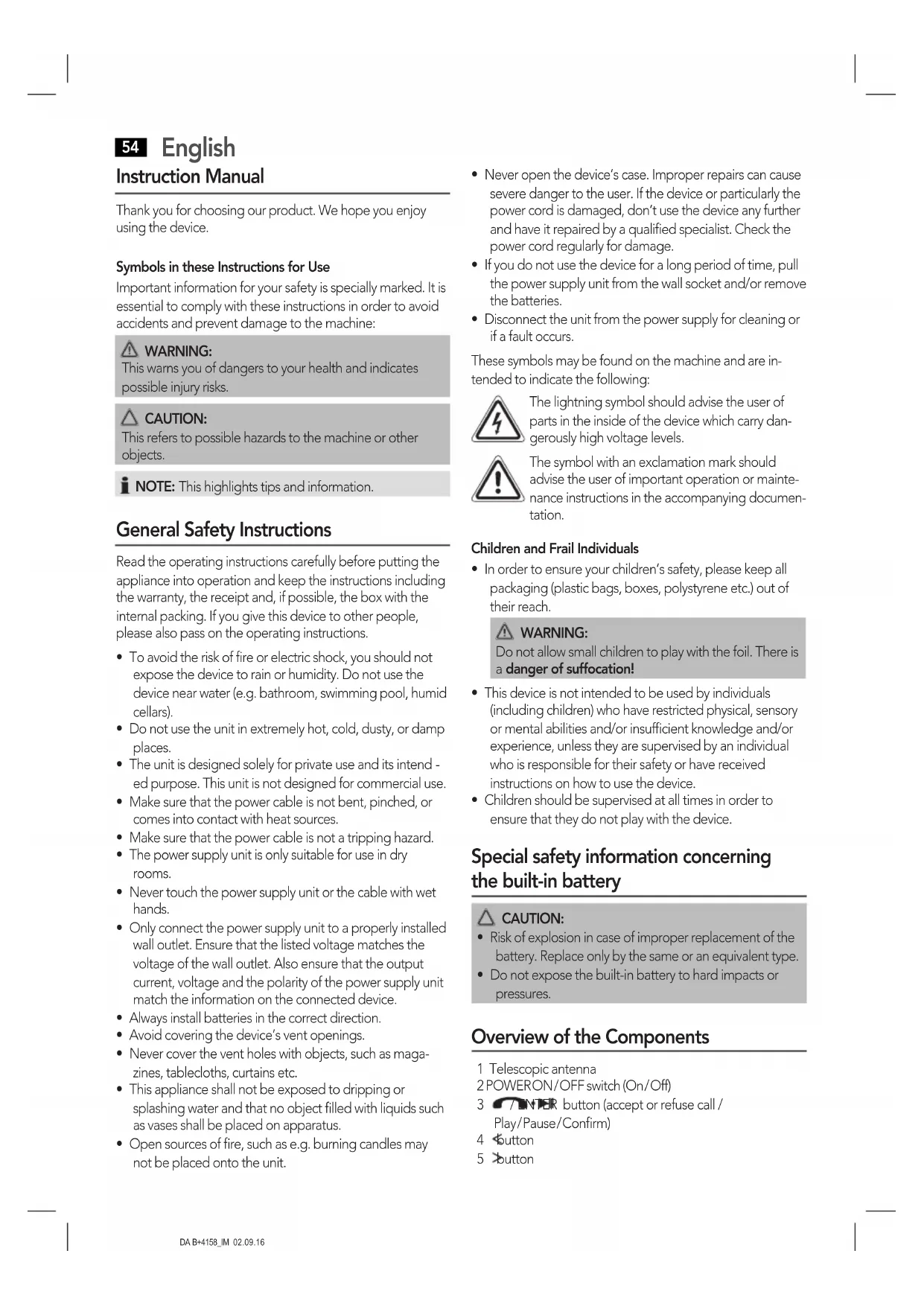 - Children should be supervised at all times in order to ensure that they do not play with the device. Special safety information concerning the built-in battery CAUTION: