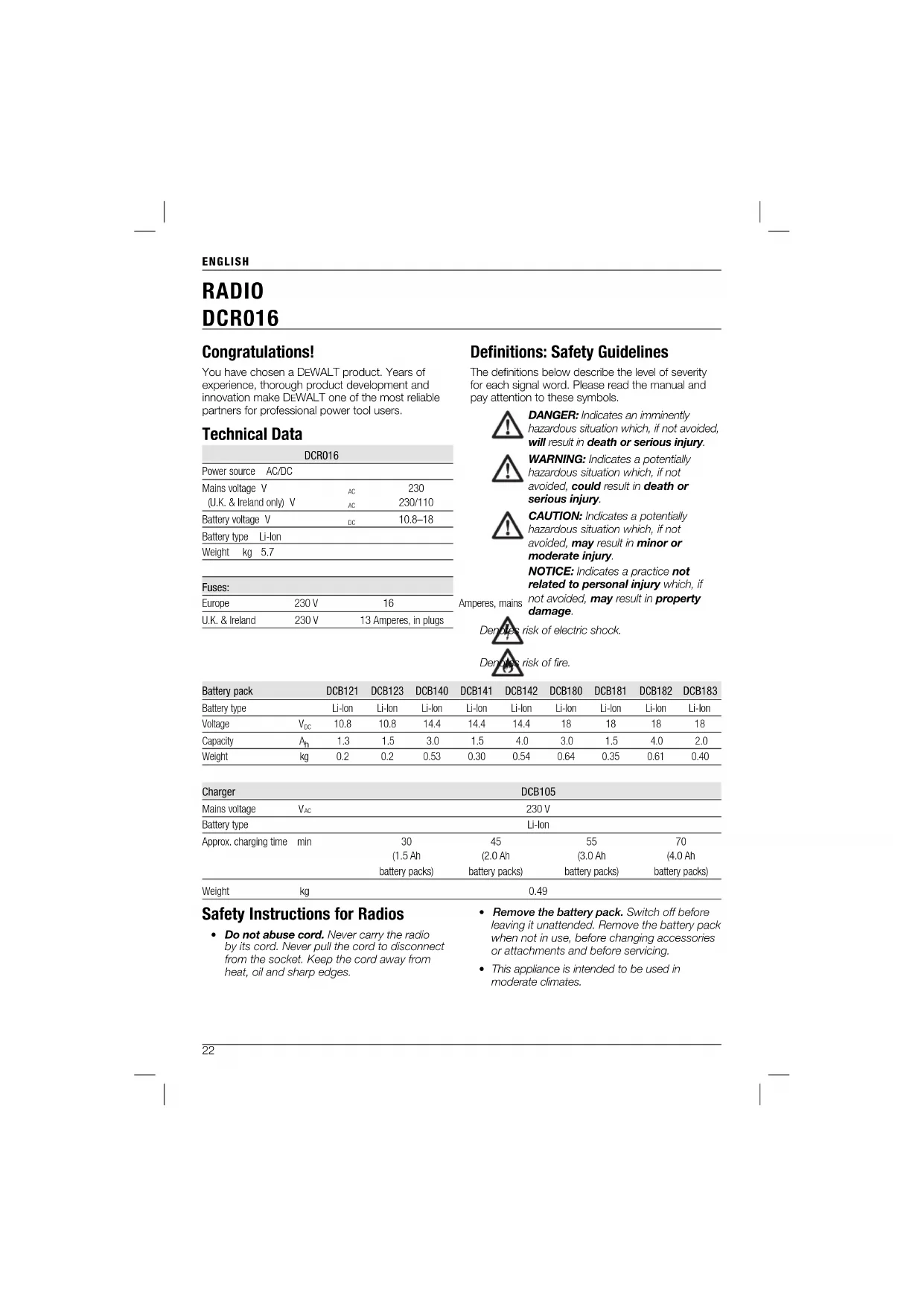 - Mains plug is used as the disconnect device; the disconnect device (plug) shall remain readily operable. Markings on Radio The following pictograms are shown on the radio: Read instruction manual. Important Safety Instructions for All Battery Chargers SAVE THESE INSTRUCTIONS: This manual contains important safety and operating instruc tions for the DCB105 battery charger.