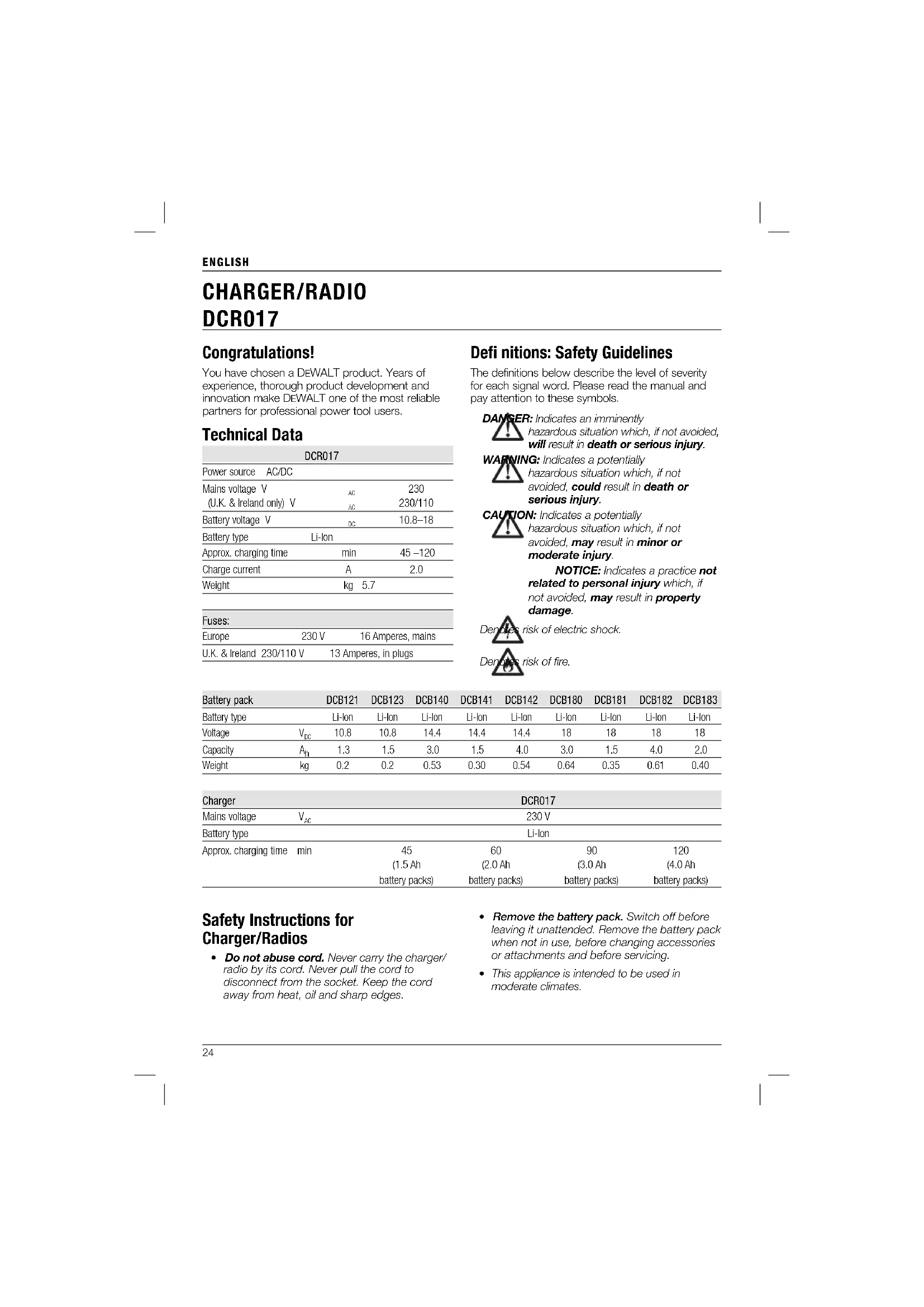 Chargers The DCR017 charger/radio accepts 10.8–18 V Li-Ion batteries. This radio/charger requires no adjustment and is designed to be as easy as possible to operate.ENGLISH