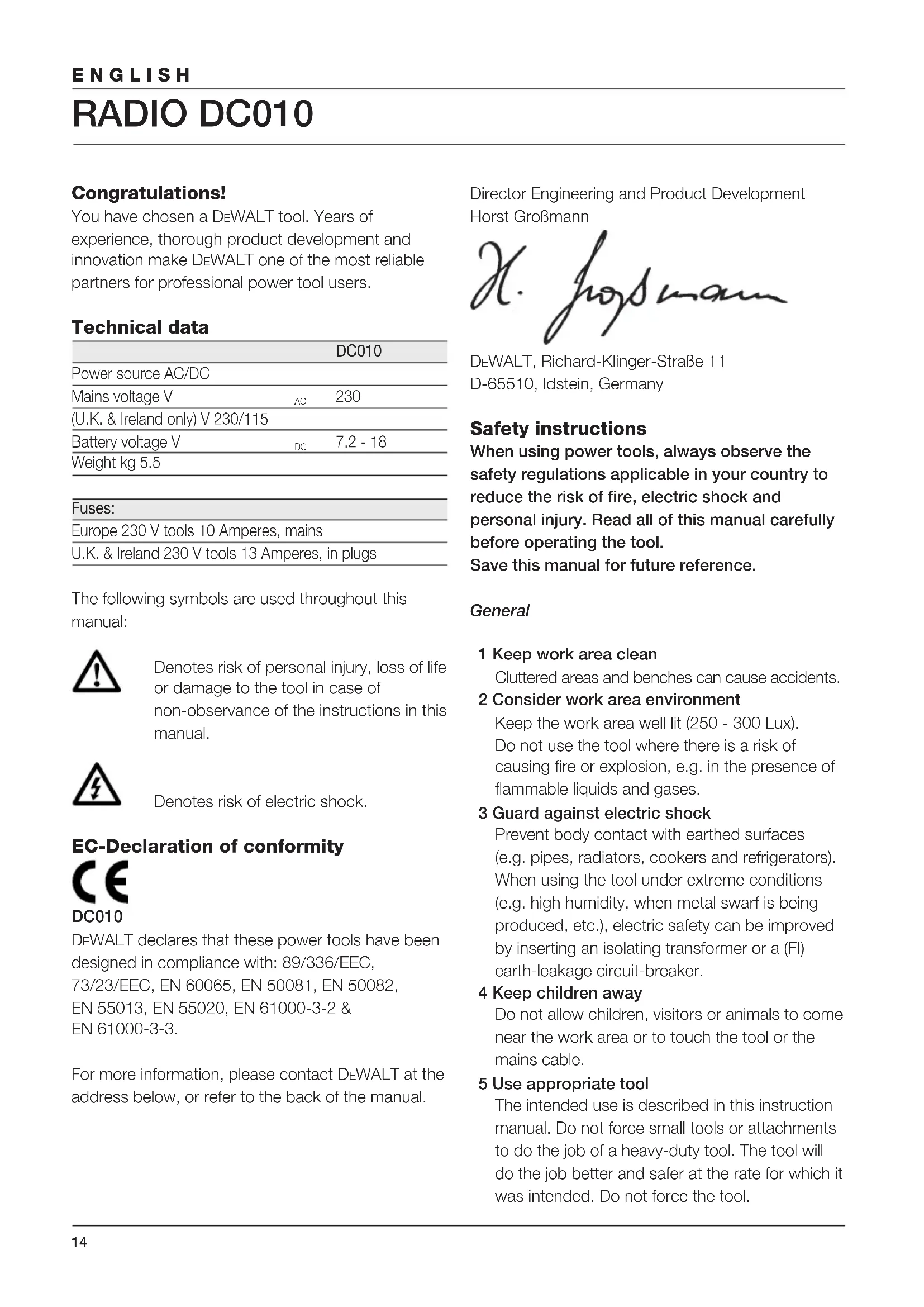 Weight kg 5.5 Fuses: Europe 230 V tools 10 Amperes, mains U.K. & Ireland 230 V tools 13 Amperes, in plugs The following symbols are used throughout this manual: Denotes risk of personal injury, loss of life or damage to the tool in case of non-observance of the instructions in this manual. Denotes risk of electric shock. EC-Declaration of conformity DC010 DEWALT declares that these power tools have been designed in compliance with: 89/336/EEC, 73/23/EEC, EN 60065, EN 50081, EN 50082, EN 55013, EN 55020, EN 61000-3-2 & EN 61000-3-3. For more information, please contact DEWALT at the address below, or refer to the back of the manual. Director Engineering and Product Development Horst Großmann DEWALT, Richard-Klinger-Straße 11 D-65510, Idstein, Germany Safety instructions When using power tools, always observe the safety regulations applicable in your country to reduce the risk of fire, electric shock and personal injury. Read all of this manual carefully before operating the tool. Save this manual for future reference. General 1 Keep work area clean Cluttered areas and benches can cause accidents. 2 Consider work area environment Keep the work area well lit (250 - 300 Lux). Do not use the tool where there is a risk of causing fire or explosion, e.g. in the presence of flammable liquids and gases. 3 Guard against electric shock Prevent body contact with earthed surfaces (e.g. pipes, radiators, cookers and refrigerators). When using the tool under extreme conditions (e.g. high humidity, when metal swarf is being produced, etc.), electric safety can be improved by inserting an isolating transformer or a (FI) earth-leakage circuit-breaker. 4 Keep children away Do not allow children, visitors or animals to come near the work area or to touch the tool or the mains cable. 5 Use appropriate tool The intended use is described in this instruction manual. Do not force small tools or attachments to do the job of a heavy-duty tool. The tool will do the job better and safer at the rate for which it was intended. Do not force the tool.15 ENGLISH Warning! The use of any accessory or attachment or performance of any operation with this tool other than those recommended in this instruction manual may present a risk of personal injury. 6 Check for damaged parts Before using the tool, carefully check it for damage to ensure that it will operate properly and perform its intended function. Check for misalignment and seizure of moving parts, breakage of parts and any other conditions that may affect its operation. Have damaged guards or other defective parts repaired or replaced as instructed. Do not use the tool if the switch is defective. Have the switch replaced by an authorized DEWALT repair agent. 7 Store idle tools When not in use, tools must be stored in a dry place and locked up securely, out of reach of children. 8 Maintain tools with care Keep the tools in good condition and clean for better and safer performance. Follow the instructions for maintenance and changing accessories. Keep all handles and switches dry, clean and free from oil and grease. 9 Repairs This tool is in accordance with the relevant safety regulations. Have your tool repaired by an authorised DEWALT repair agent. Repairs should only be carried out by qualified persons using original spare parts; otherwise this may result in considerable danger to the user. Safety instructions for mains-powered tools 10 Extension cables Before use, inspect the extension cable and replace if damaged. When using the tool outdoors, only use extension cables intended for outdoor use and marked accordingly. 11 Unplug tool Switch off and wait for the tool to come to a complete standstill before leaving it unattended. Unplug the tool when not in use, before changing any parts of the tools, accessories or attachments and before servicing. 12 Do not abuse cord Never carry the tool by its cord. Never pull the cord to disconnect from the socket. Keep the cord away from heat, oil and sharp edges. Safety instructions for battery-powered tools 13 Remove the battery pack Switch off and wait for the tool to come to a complete standstill before leaving it unattended. Remove the battery pack when not in use, before changing any parts of the tools, accessories or attachments and before servicing. Package contents The package contains: 1 Radio 1 Instruction manual 1 Exploded drawing
