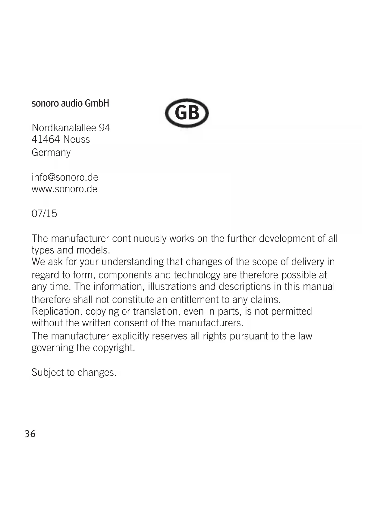 sonoro audio GmbH Nordkanalallee 94 41464 Neuss Germany info@sonoro.de www.sonoro.de 07/15 The manufacturer continuously works on the further development of all types and models. We ask for your understanding that changes of the scope of delivery in regard to form, components and technology are therefore possible at any time. The information, illustrations and descriptions in this manual therefore shall not constitute an entitlement to any claims. Replication, copying or translation, even in parts, is not permitted without the written consent of the manufacturers. The manufacturer explicitly reserves all rights pursuant to the law governing the copyright. Subject to changes. GBEnglish